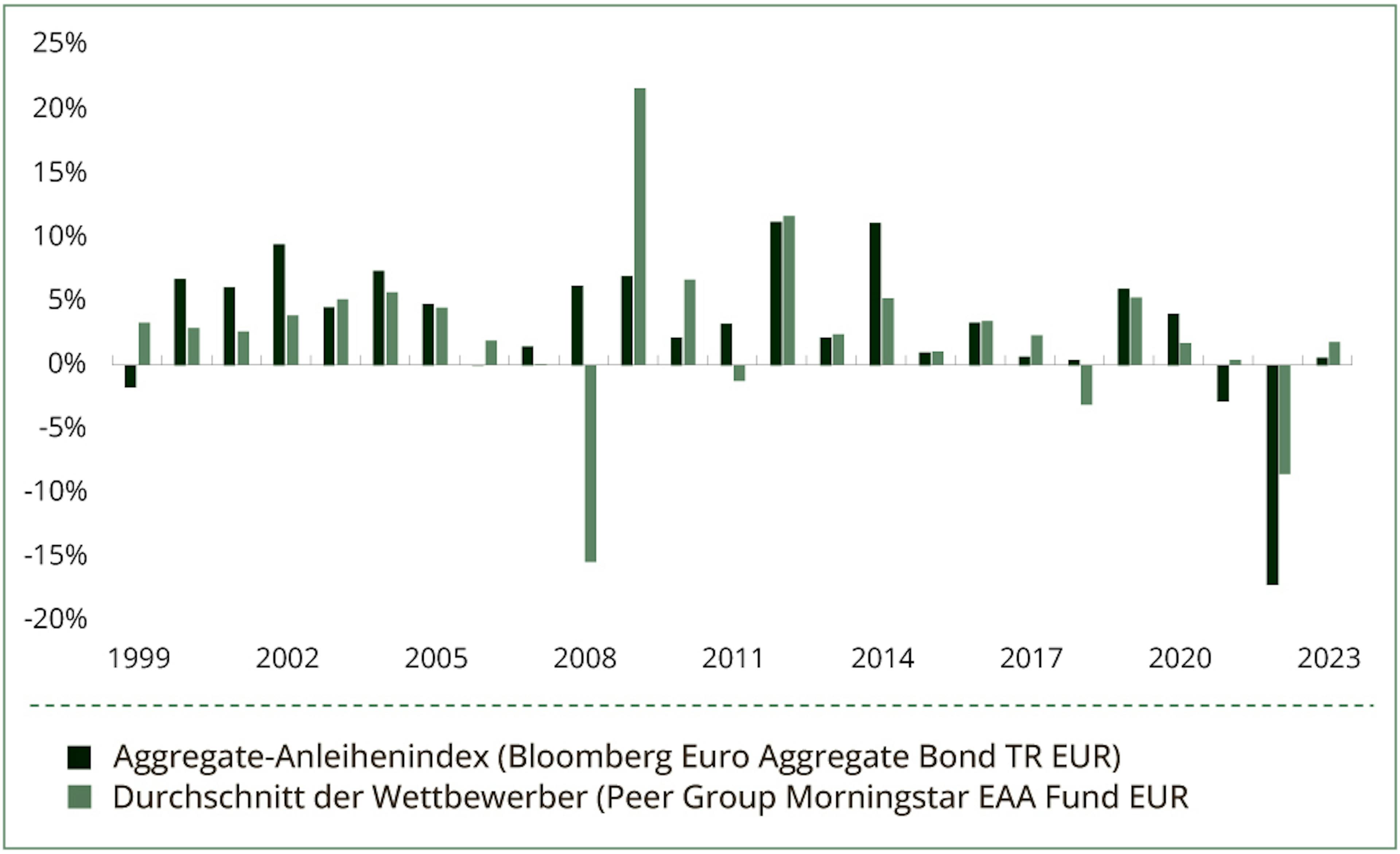 1+4,38% im Durchschnitt für flexible Anleihefonds – Morningstar-Kategorie: EAA Fund EUR Flexible Bond gegenüber -0,13% für den Bloomberg Euro Aggregate Bond Index.
