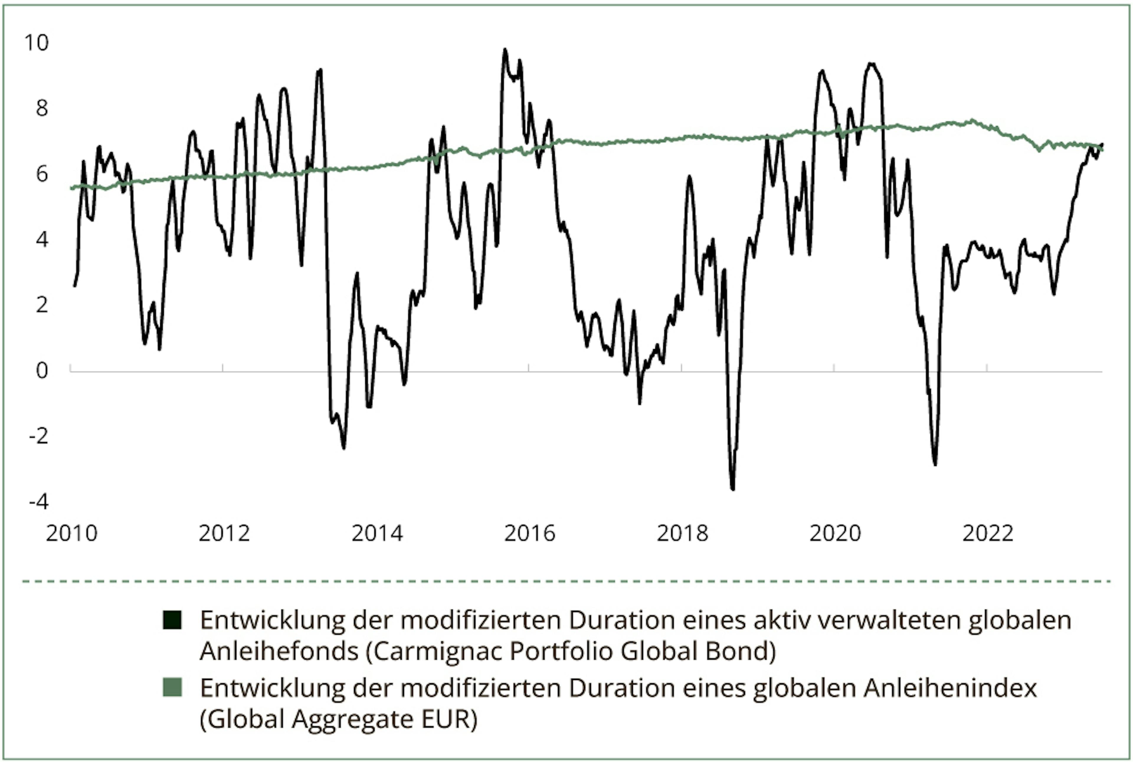 Entwicklung der modifizierten Duration des Fonds Carmignac Portfolio Global Bond und eines Referenzindikators