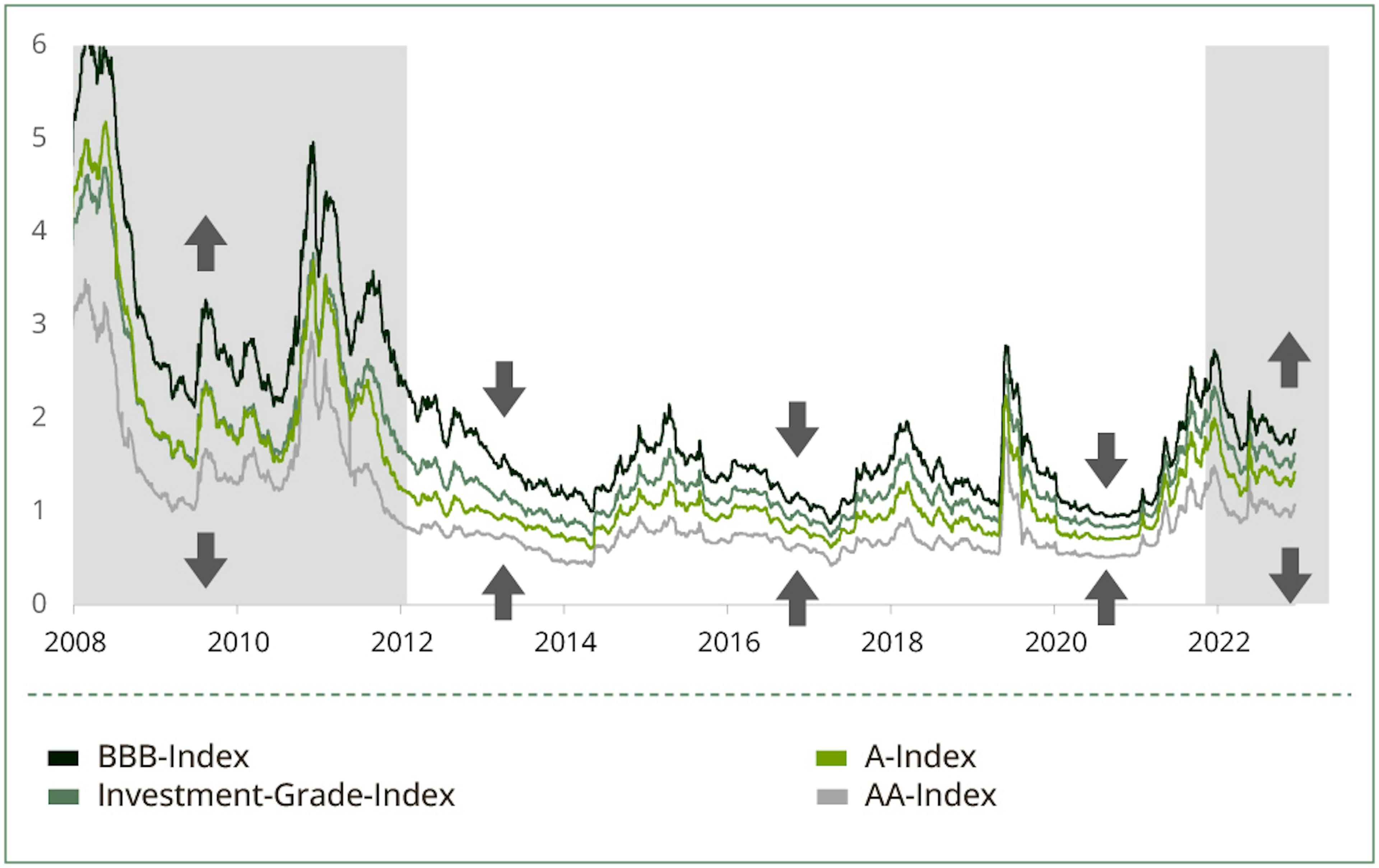 Vor diesem Hintergrund stellt sich die Frage, ob die aktive Verwaltung einen Mehrwert bietet. Nach den Aufwärtsphasen kam es immer wieder zu Rückschlägen, und dann zahlte sich die aktive Verwaltung regelmäßig aus. Sie lieferte über den gesamten Zeitraum eine Outperformance, die in den Stressphasen, die die letzten zwei Jahrzehnte prägten, erzielt wurde: insbesondere im Zuge der Finanzkrise der 2000er Jahre, während der europäischen Staatsschuldenkrise zwischen Mitte 2010 und Mitte 20111, während des „Taper Tantrum“ im Jahr 20132 oder kürzlich angesichts der Rückkehr der Inflation und der geldpolitischen Wende der Zentralbanken im Jahr 20223.