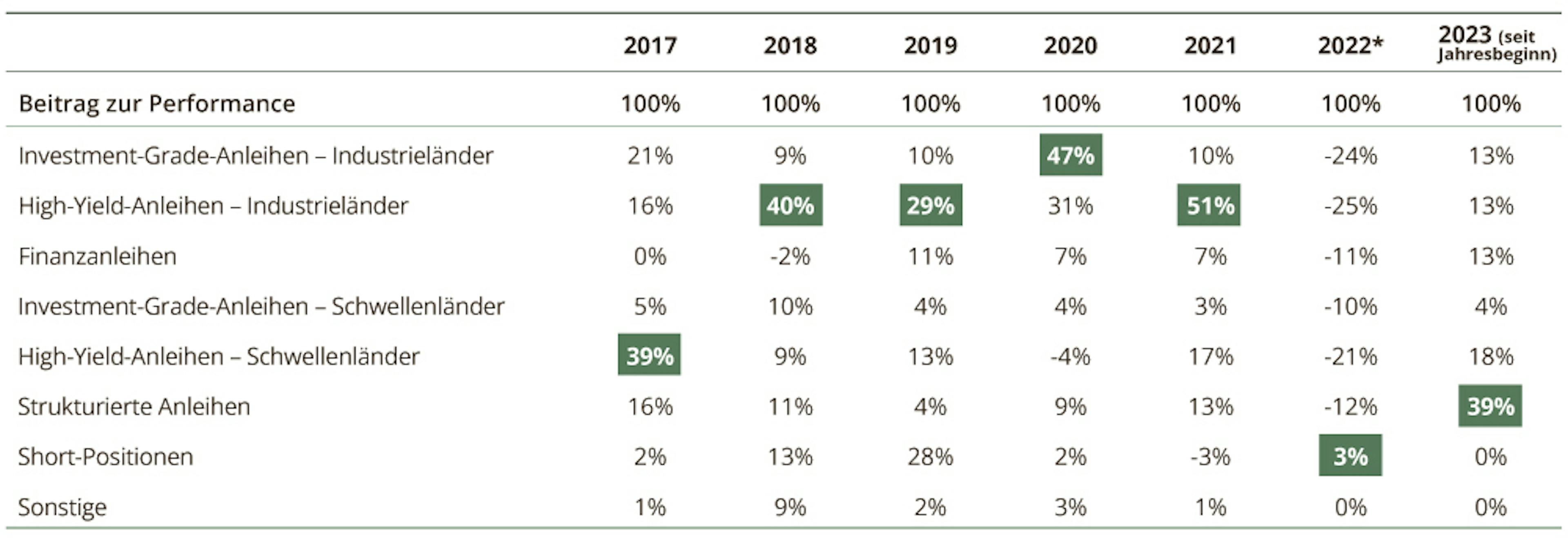 Zum einen kann man bei einer breiten Allokation davon profitieren, dass sich die verschiedenen Anleihensegmente gegenseitig ergänzen. In Marktphasen wie 2022 und 2023 profitierten beispielsweise variabel verzinsliche Segmente wie strukturierte Anleihen von steigenden Zinsen, während andere Segmente unter der schlechten Kursentwicklung von Anleihen litten (wie die folgende Tabelle zeigt, fallen die Performancebeiträge der verschiedenen Segmente von Jahr zu Jahr sehr unterschiedlich aus; dies kommt Anlegern des Fonds zugute, der seit seiner Auflegung jedes Jahr besser abgeschnitten hat als der Index).
