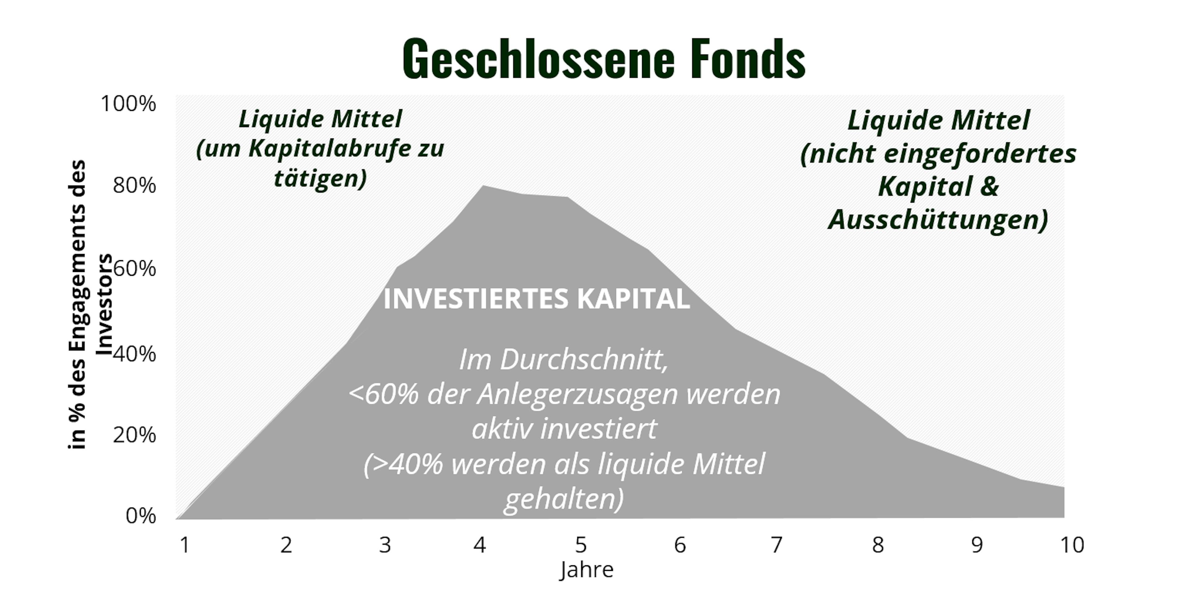 Es ist wichtig zu wissen, dass geschlossene Fonds in der Regel internen Zinsfuß (IRR) verwenden, der nur die Rendite des tatsächlich investierten Betrags berücksichtigt, wie in der Grafik links dargestellt. Dieser investierte Betrag stellt oft nur einen Bruchteil des gesamten zugesagten Kapitals dar, im Durchschnitt etwa 60 % während der Laufzeit des Fonds. Zusagen, die noch nicht investiert wurden, verbleiben als Barmittel im Besitz des Anlegers und unterliegen einer anderen Rendite, die von den Fähigkeiten und der Erfahrung des Anlegers im Liquiditätsmanagement abhängt. Im Gegensatz dazu verwenden Evergreen-Fonds die jährliche Rendite-Metrik, die auf der Grundlage des gesamten abgerufenen Betrags vom ersten Tag an berechnet wird (siehe Grafik rechts).