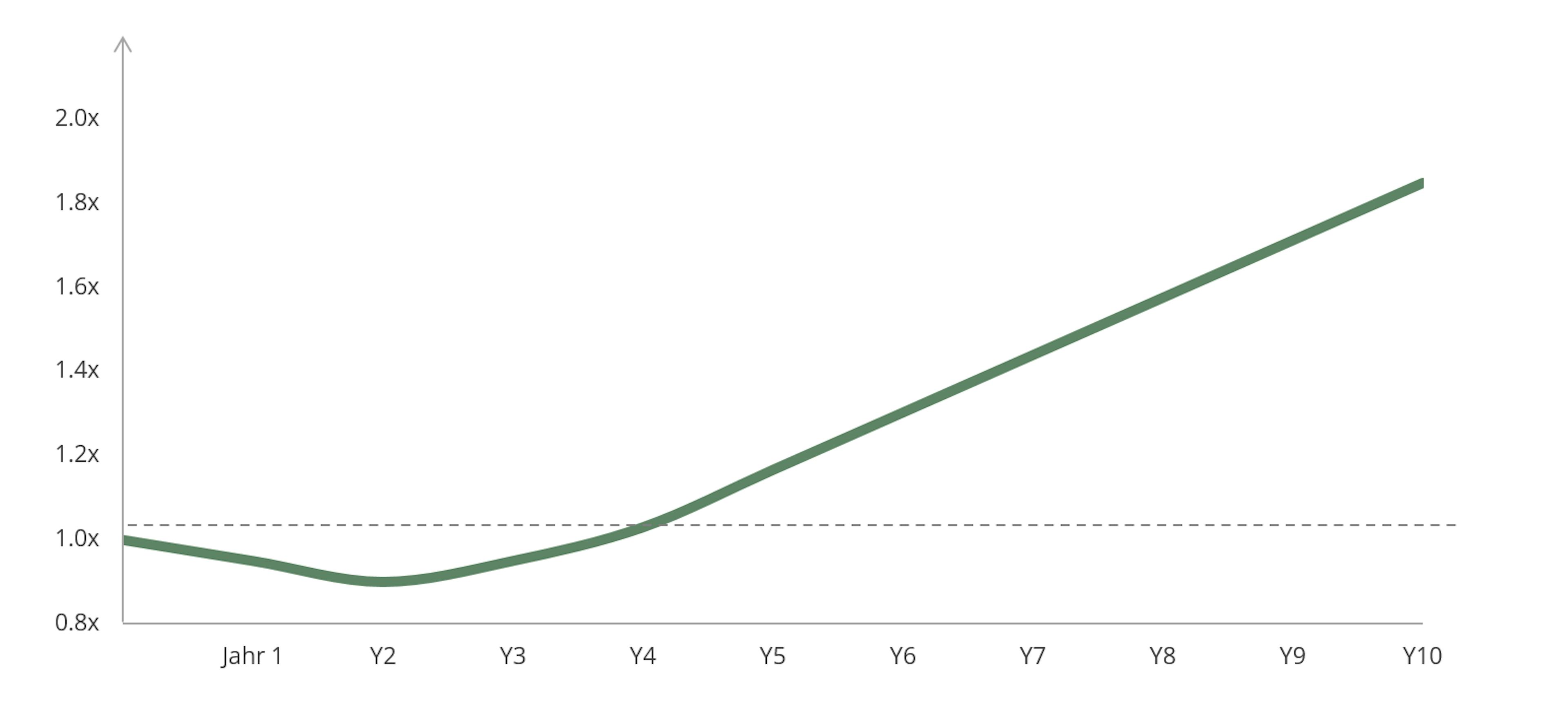 Um zu verstehen, was sich geändert hat, ist es wichtig, auf die Anfänge der Investition in geschlossene Fonds zurückzugehen. Einer der Nachteile, mit denen die Anleger früher auf den privaten Märkten konfrontiert waren, ist der so genannte "J-Kurven"-Effekt, bei dem die Nettorenditen zunächst negativ sind, wenn das Kapital für Investitionen und Gebühren abgerufen wird. Es dauert eine Weile, bis sich diese Investitionen auszahlen, da es eine gewisse Zeit dauert, das Kapital zu investieren und Renditen zu erwirtschaften, wie in der nachstehenden Grafik für die Jahre 1 bis 4 dargestellt. Dieser Effekt kann dazu führen, dass diese geschlossene Fondsstruktur für viele Anleger weniger geeignet ist, insbesondere wenn die Struktur bedeutet, dass das Kapital für die gesamte Laufzeit des Fonds, die bis zu 12 Jahre betragen kann, gebunden ist. Außerdem müssen die Anleger den Verwaltungsaufwand für die Verwaltung der progressiven Kapitalabrufe und die Reinvestition der Ausschüttungen tragen, im Gegensatz zu einer Evergreen-Fonds-Struktur, bei der das Kapital investiert werden kann und die Renditen fast sofort fließen.