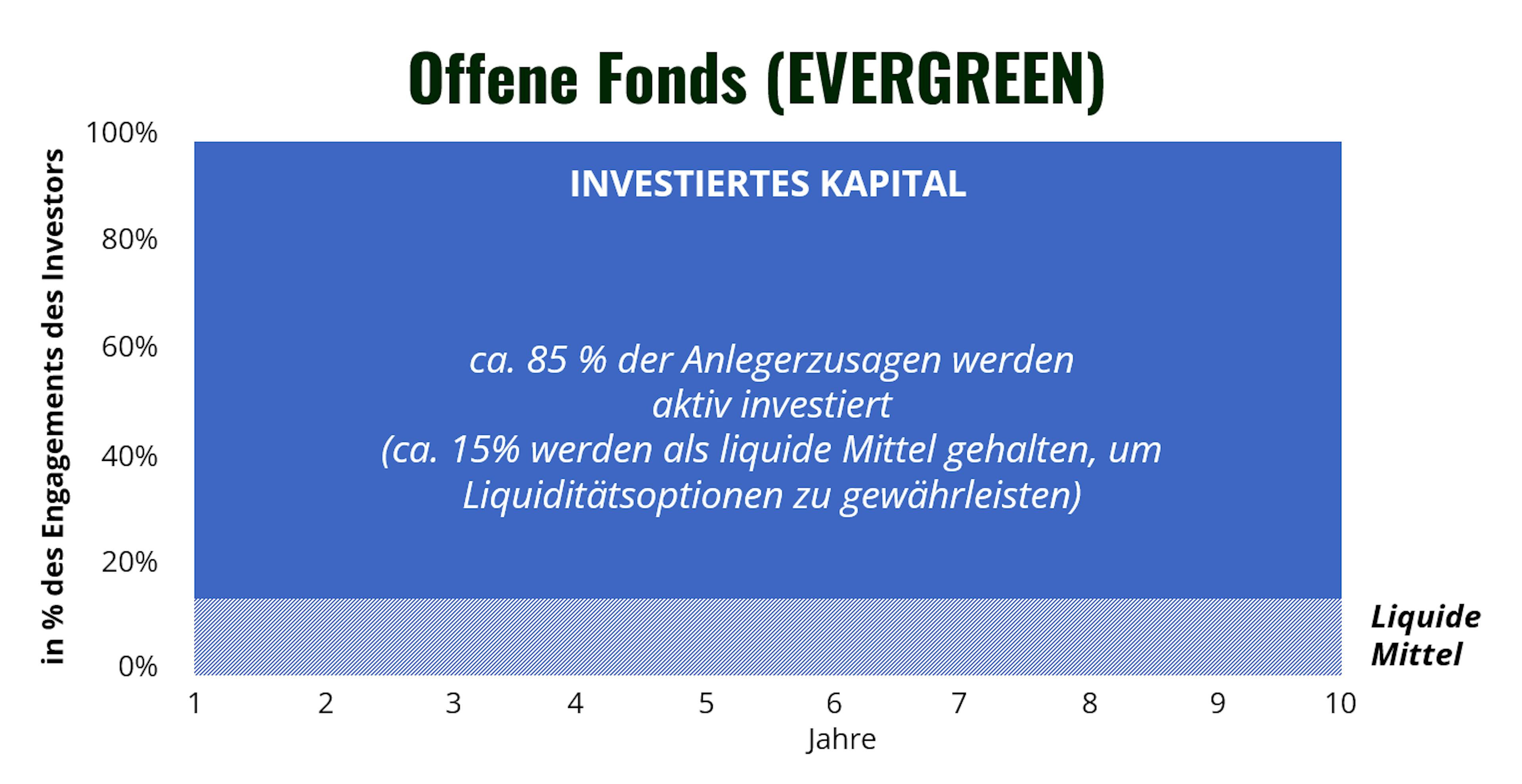 Bei einem Evergreen-Fonds werden 100 % des Kapitals vom ersten Tag an abgerufen: Die Anleger sind sofort an einem Portfolio privater Unternehmen beteiligt und können von der Wertsteigerung der bereits in den Fonds getätigten Investitionen profitieren. Dadurch wird der J-Kurven-Effekt gemildert, der bei geschlossenen Fonds auftritt. Eine positive Rendite könnte sogar innerhalb eines Monats nach der Investition möglich sein, wenn die bestehenden Investitionen an Wert gewinnen.