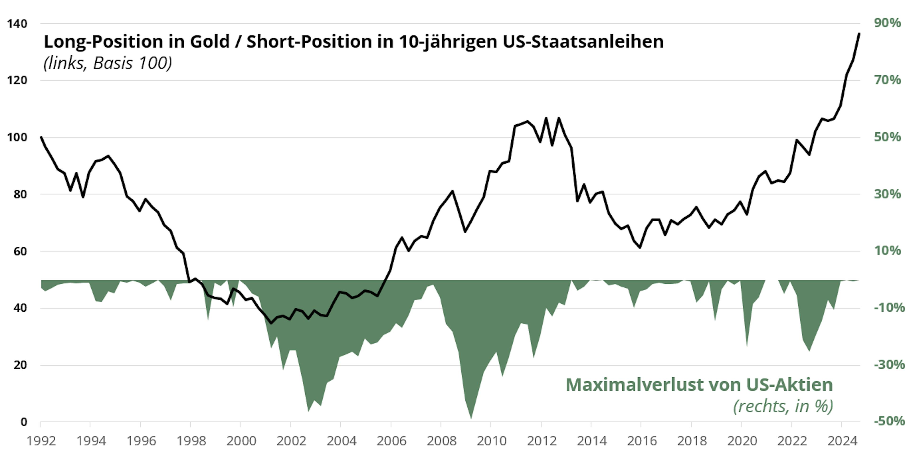 Wertentwicklung einer Strategie mit einer Long-Position in Gold und einer Short-Position in Staatsanleihen im Vergleich zum Maximalverlust von US-Aktien.