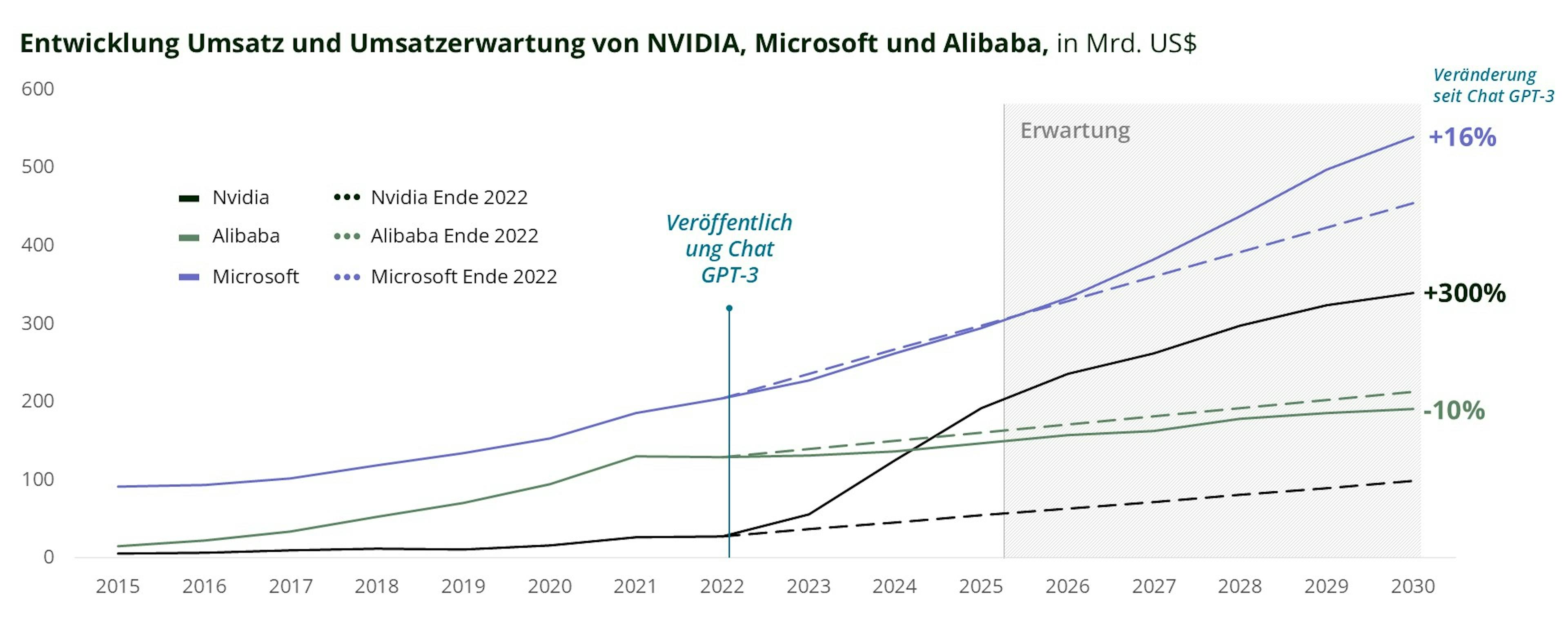 Aufgrund dieser Ausnahmesituation wurden die Wachstumsprognosen von Nvidia (schwarze Kurve in der Grafik) um 300 Prozent nach oben korrigiert und es wird erwartet, dass sich der Umsatz des Unternehmens innerhalb von zwei Jahren verdoppeln und innerhalb von fünf Jahren verdreifachen wird.
