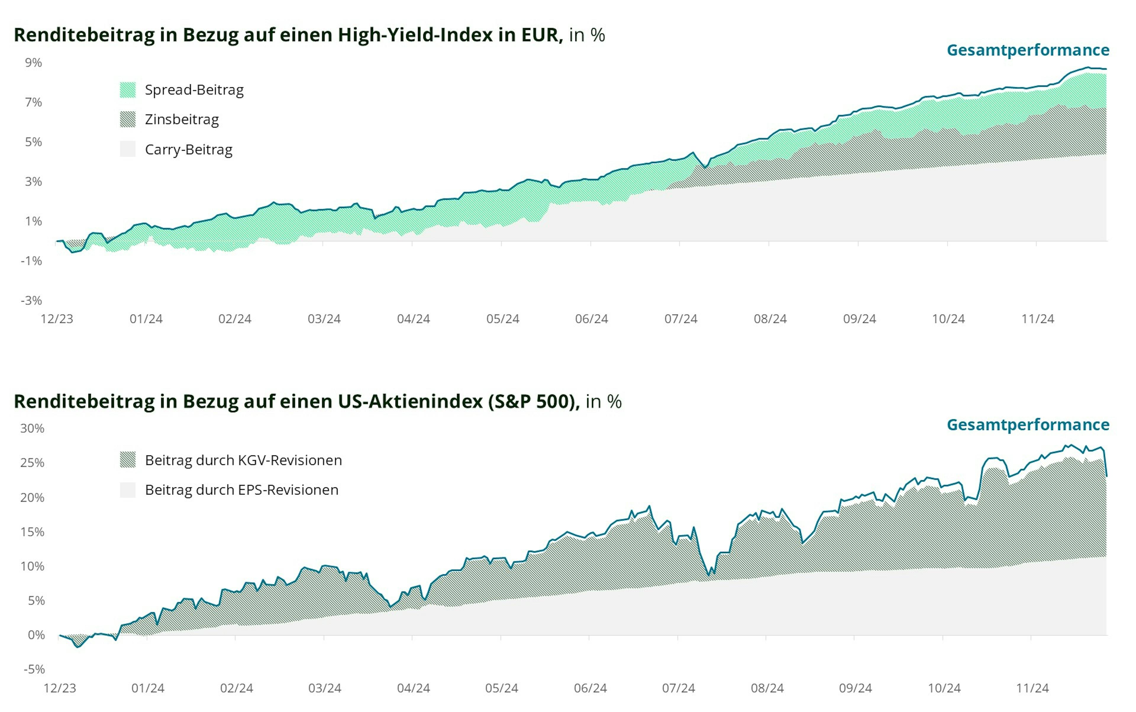 Die nachstehende Grafik zeigt die einzelnen Performancetreiber (und Negativfaktoren) der US-Aktienmärkte und der europäischen High-Yield-Märkte.