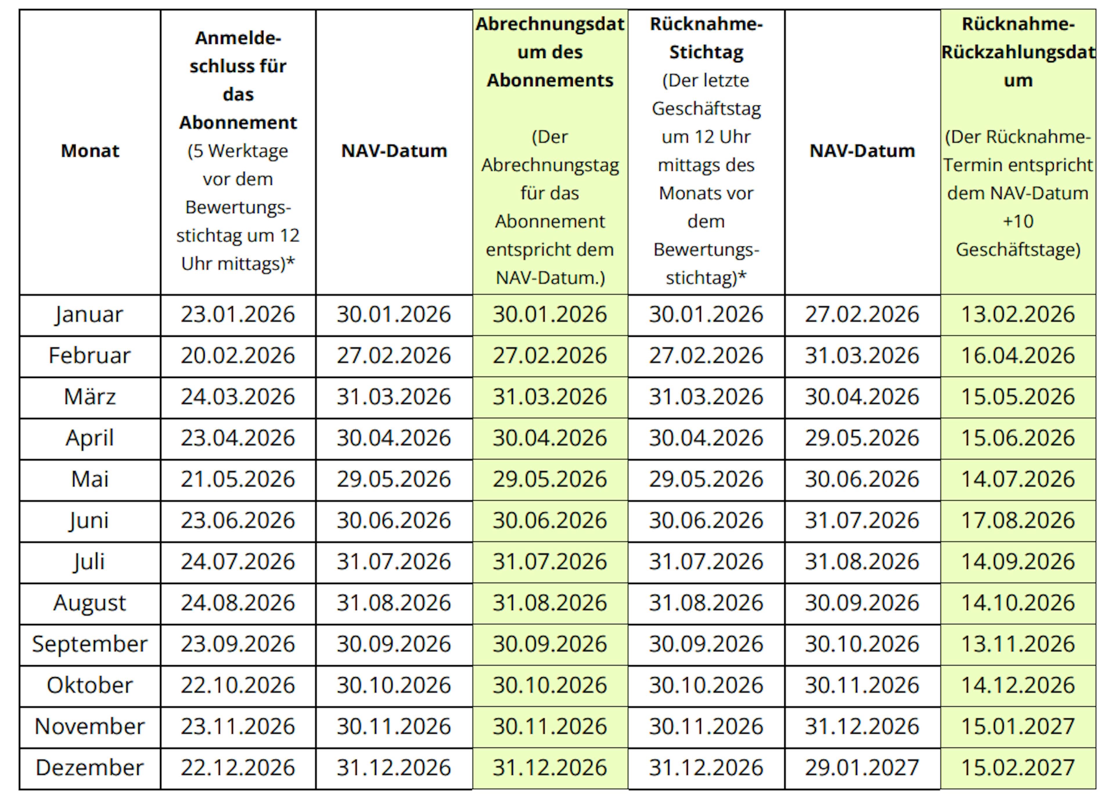 Der Netto-Inventarwert (NAV) wird gemäß der Beschreibung im Prospekt und im entsprechenden Nachtrag zu den Terminen berechnet und veröffentlicht, zu denen die Anteile und Anteile ausgegeben oder zurückgenommen werden können. Die Annahmeschlussfrist für Zeichnungen endet 5 Werktage vor dem NAV-Berechnungsdatum, die Annahmeschlussfrist für Rücknahmen endet 30 Werktage vor dem NAV-Berechnungsdatum. Der Prospekt sieht außerdem vor, dass stets ein Nettoinventarwert zum 31. Dezember veröffentlicht werden muss, auch wenn der 31. Dezember kein Geschäftstag und kein Handelstag ist.
