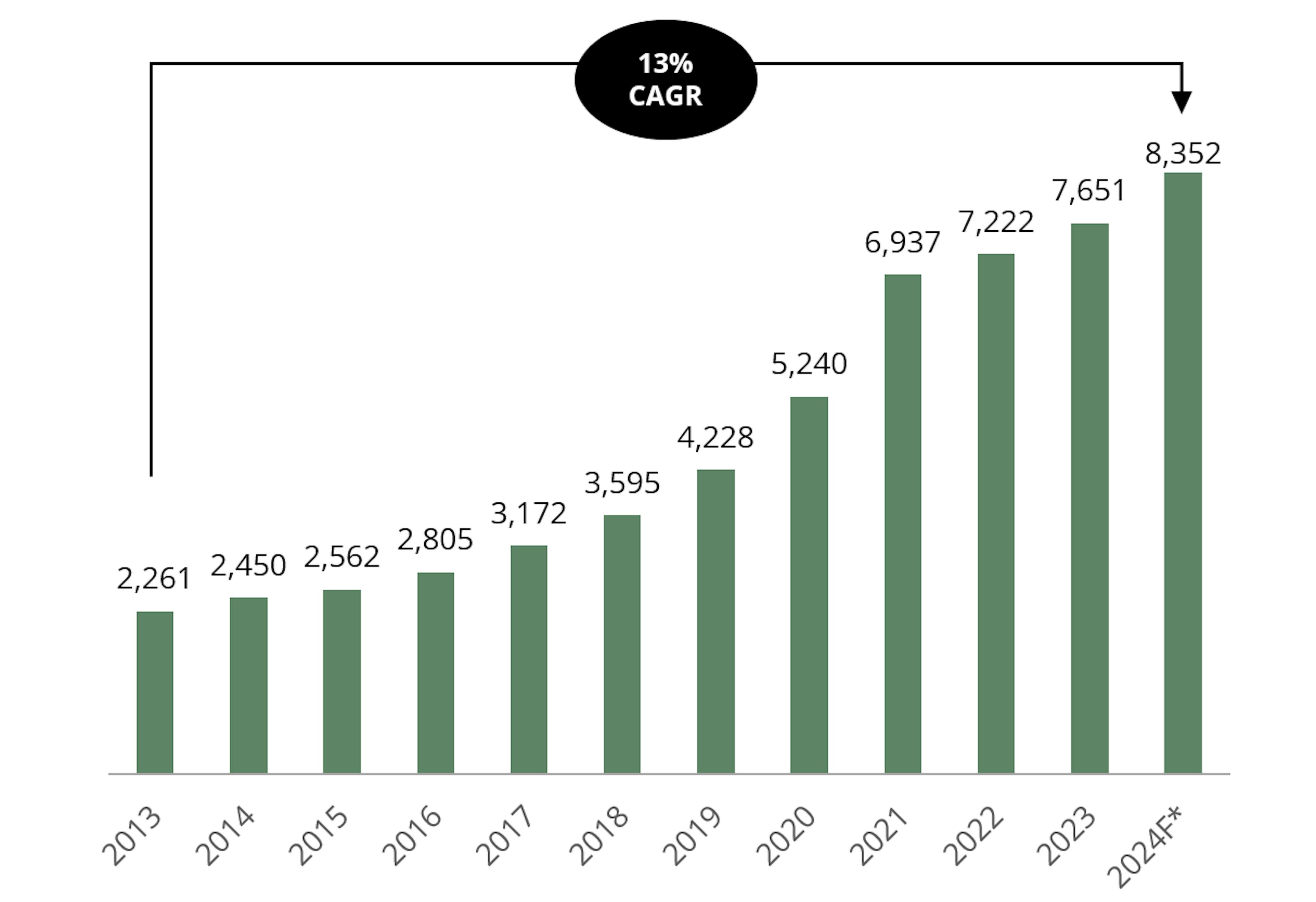Quelle: Evercore Secondary Market Review 2024. CAGR steht für Compound Annual Growth Rate.