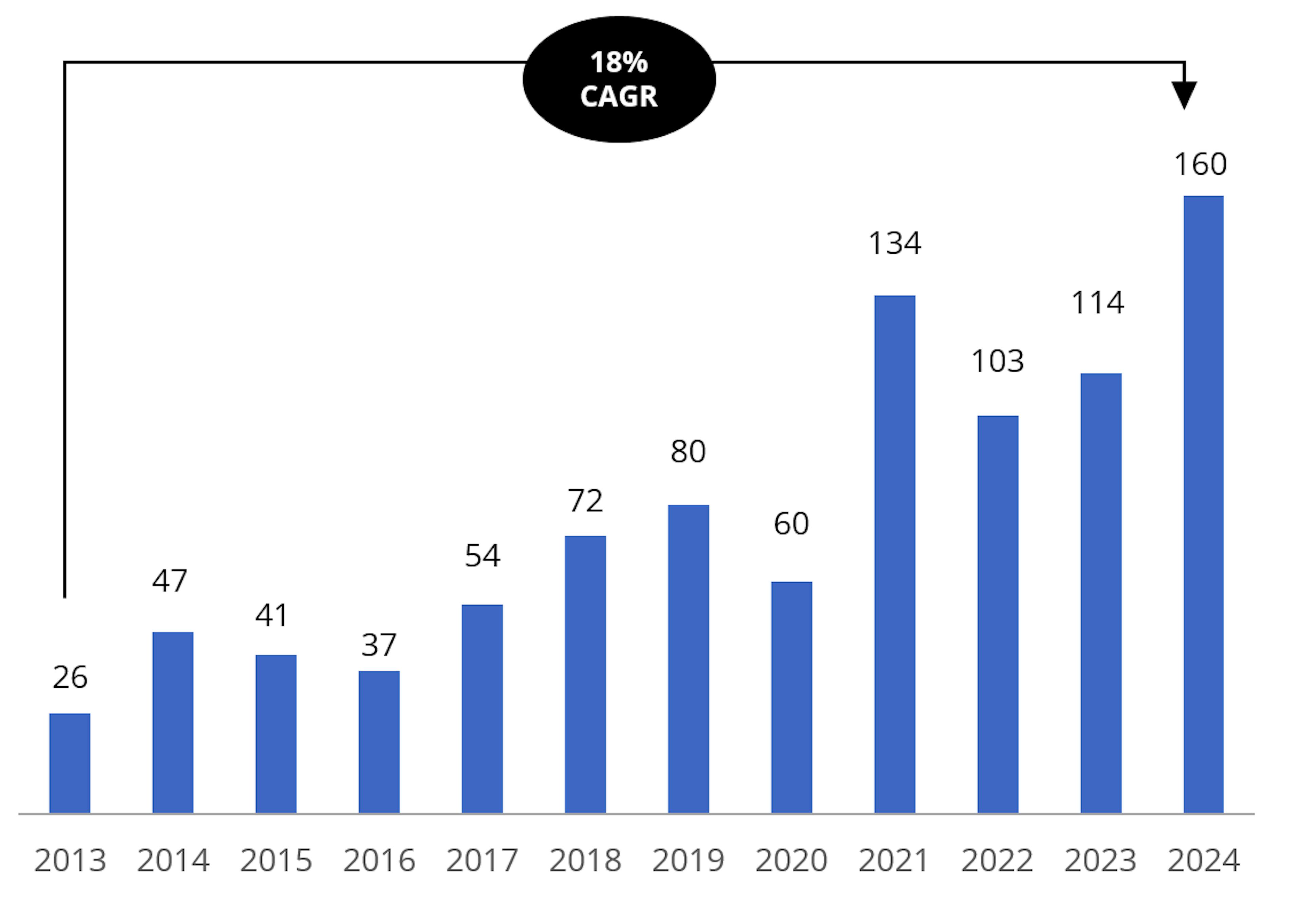 Der Private Equity-Sekundärmarkt hat sich von einer obskuren Ecke alternativer Investitionen zu einem florierenden Ökosystem mit rekordverdächtigen Transaktionsvolumina entwickelt. Was einst ein Nischenmarkt war, der hauptsächlich notleidenden Verkäufern diente, hat sich dramatisch entwickelt. Im Jahr 2024 erreichte der weltweite Sekundärmarkt mit einem Transaktionsvolumen von ca. 160 Mrd. USD ein Allzeithoch, was ein bemerkenswertes Wachstum gegenüber 114 Mrd. USD im Jahr 2023 und 103 Mrd. USD im Jahr 2022 darstellt. In den letzten zehn Jahren ist der Sekundärmarkt mit einer beeindruckenden durchschnittlichen jährlichen Wachstumsrate von 18 % gewachsen und hat damit sogar die robuste Wachstumsrate von 15 % des primären Private Equity-Marktes1 übertroffen.