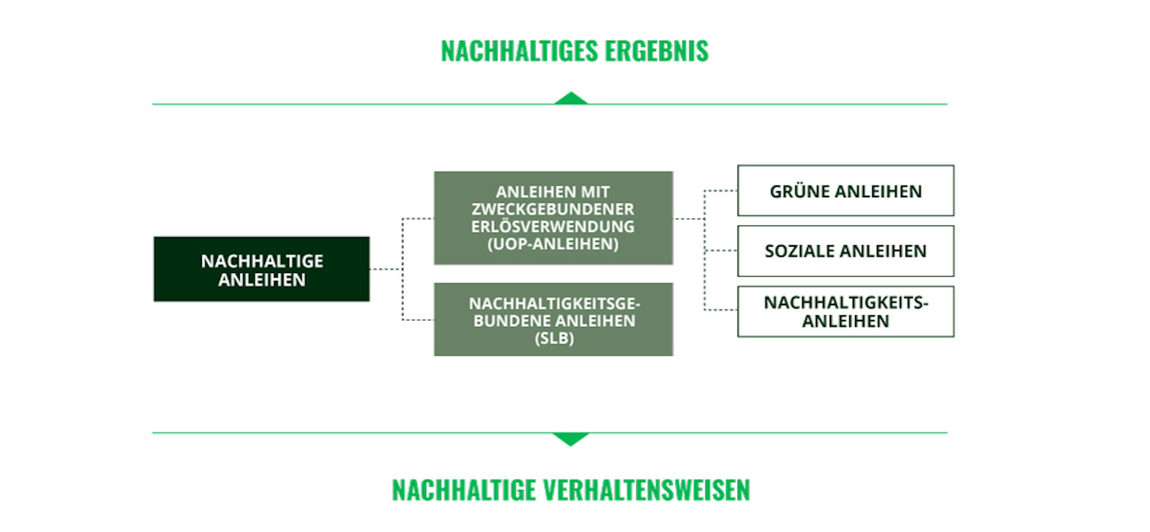 Ansatz der zweckgebundenen Erlösverwendung (bei UoP-Anleihen): Der Emittent verpflichtet sich, die mit der Anleihe erzielten Erlöse zur Finanzierung eines bestimmten Umwelt- und/oder Sozialprojekts zu verwenden. Zu dieser Kategorie gehören vor allem grüne Anleihen, soziale Anleihen und Nachhaltigkeitsanleihen. Auch Blue- und Transition-Bonds fallen in diese Kategorie.