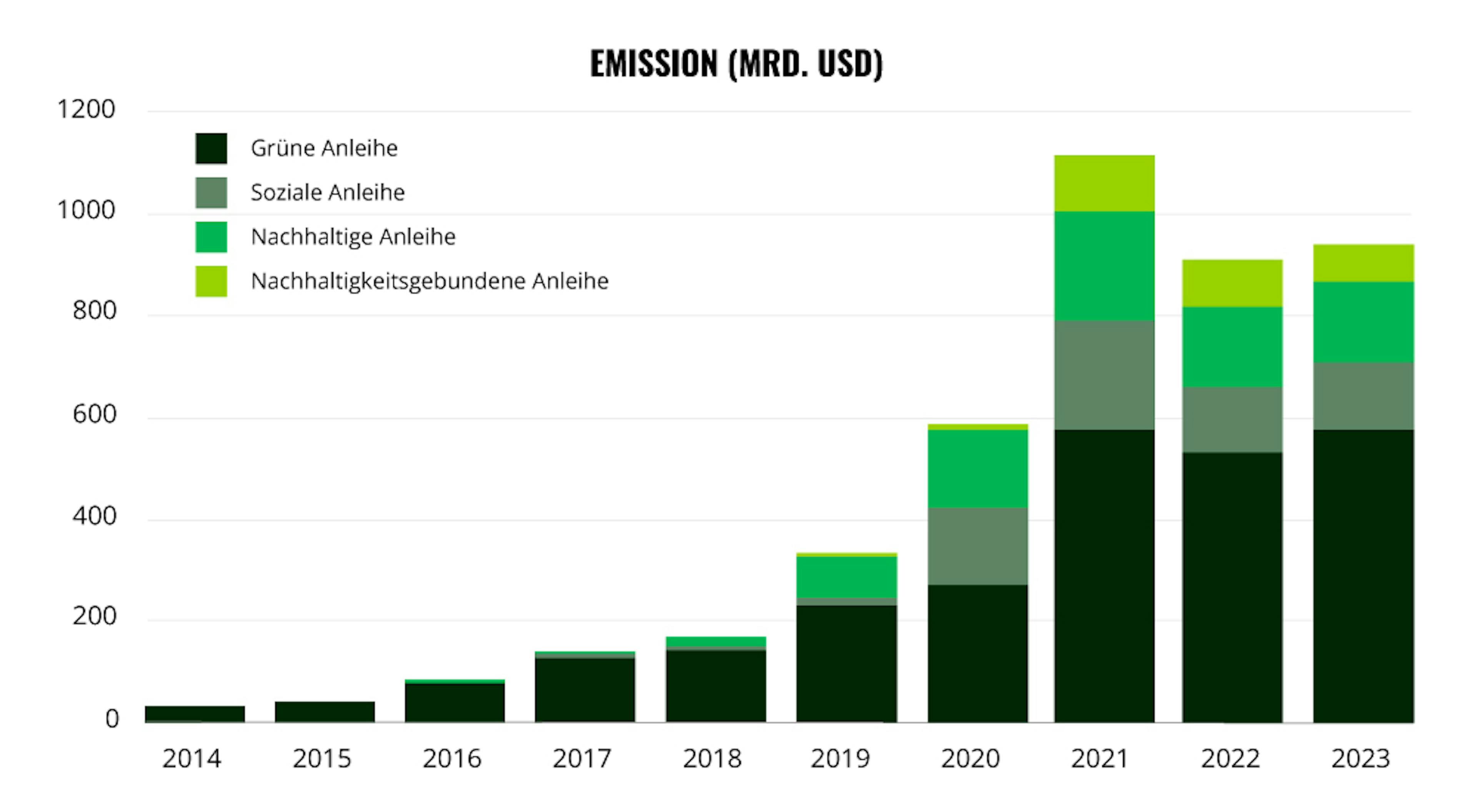 Wie nachstehend angegeben erreichte das Emissionsvolumen von nachhaltigen Anleihen seinen bisherigen Höchststand im Jahr 2021. 2023 gab es einen leichten Anstieg gegenüber 2022 (3%1), das Volumen lag 2022 jedoch deutlich unter dem hohen Niveau von 2021.
