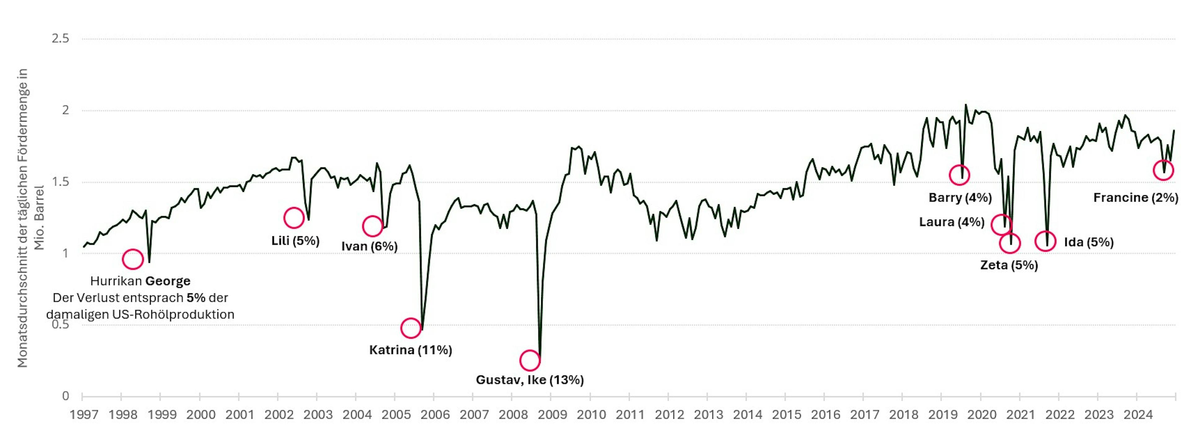 Darstellung der Auswirkungen von Hurrikans auf die Rohölförderung im Golf von Mexiko