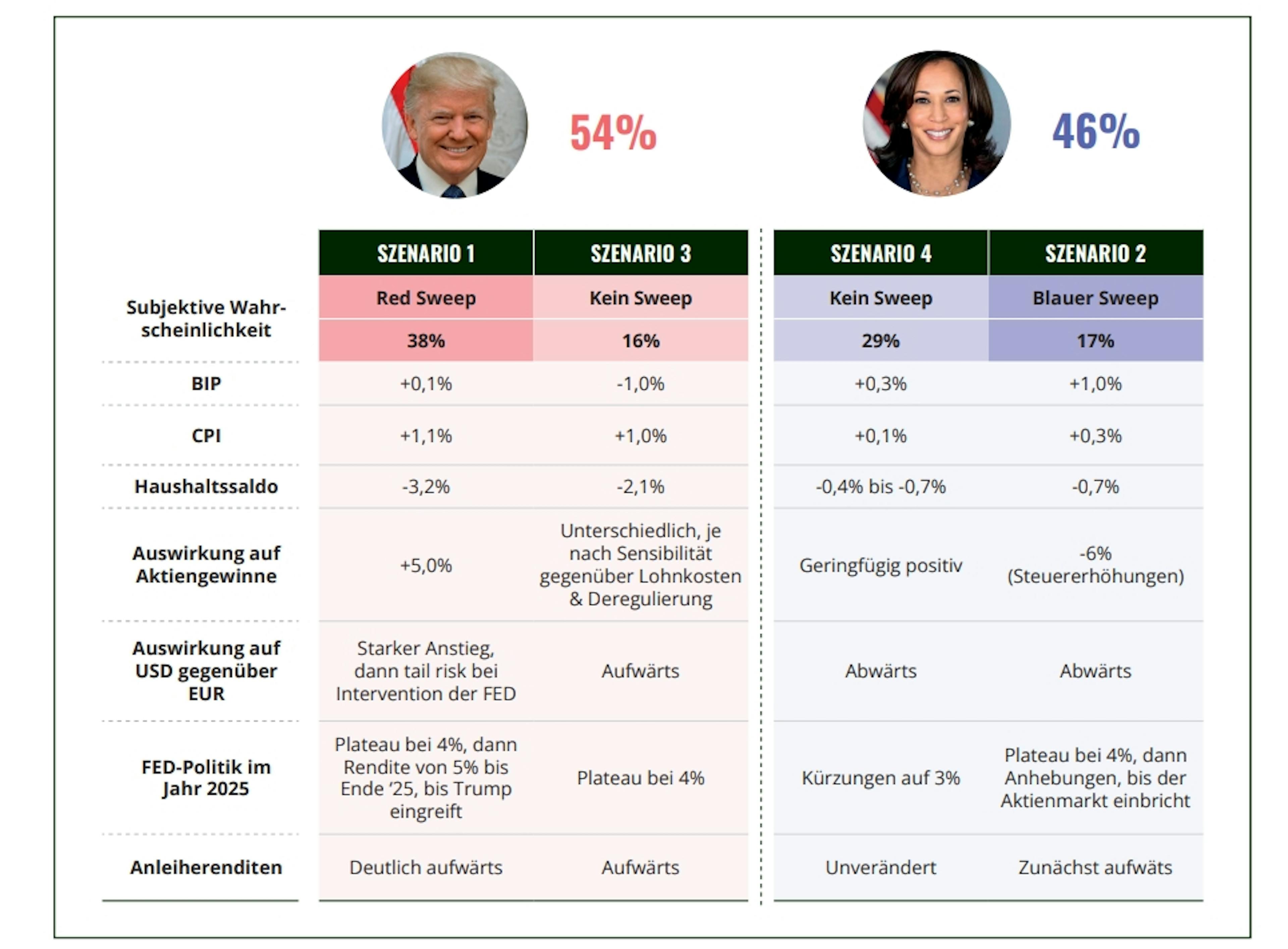 • Ein "Red Sweep" (Präsident, Senat und Repräsentantenhaus werden von den Republikanern beherrscht) würde die Inflation anheizen und das Defizit vergrößern. Die Anleiherenditen würden drastisch steigen.