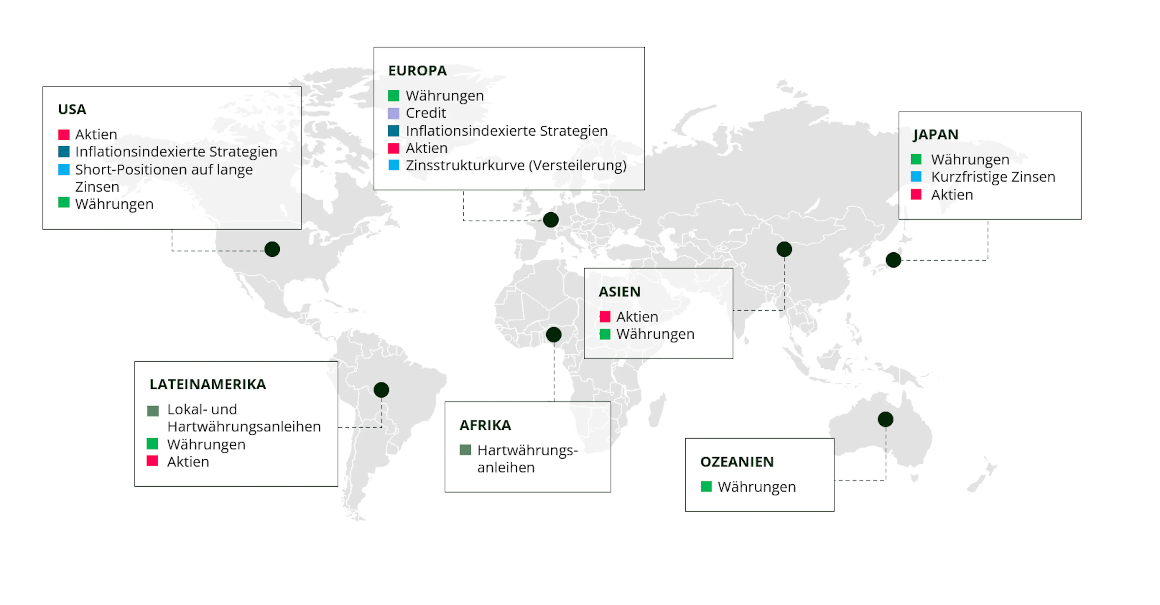 Zur Umsetzung von Diversifikations-Ansätzen gehört auch eine aktive geografische Streuung, denn Konjunkturzyklen, Geldpolitik und sektorale Entwicklungen unterscheiden sich je nach Region erheblich. Im Carmignac Patrimoine geht unsere Allokation über eine statische regionale Aufteilung hinaus. Sie basiert auf einer detaillierten Bewertung der Chancen, wodurch wir in jeder Region die relevantesten Anlageklassen ermitteln können, um ein bestimmtes Anlagethema abzubilden.