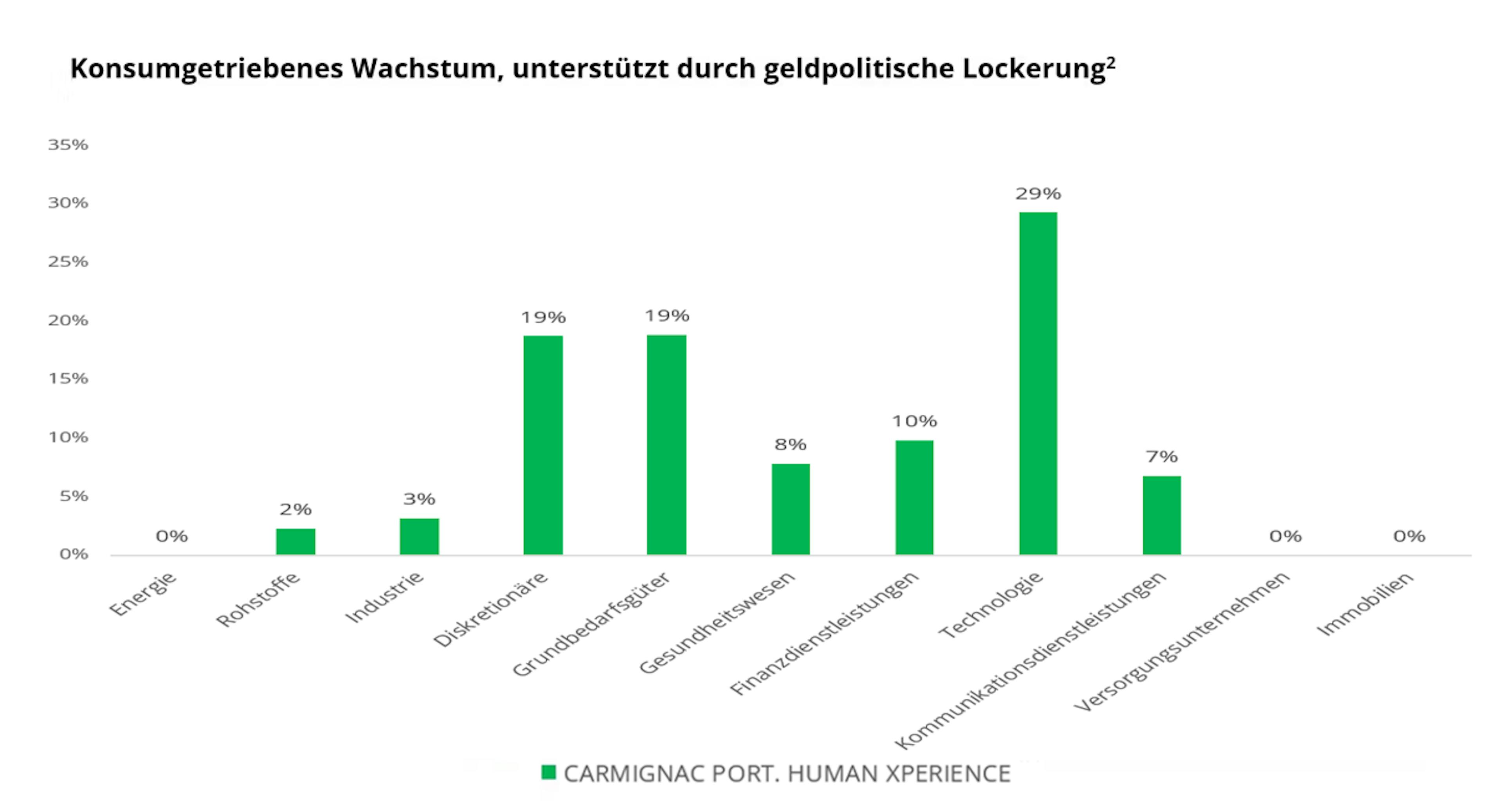Der Carmignac Portfolio Human Xperience konzentriert sich auf widerstandsfähige Wachstumsbranchen wie Basiskonsumgüter, zyklische Konsumgüter, Gesundheitswesen und Consumer-Technologie und meidet stark regulierte und zyklische Sektoren wie Energie, Rohstoffe und Versorger. Dieser Fokus gewährleistet ein Engagement in Unternehmen mit persistenter Nachfrage und strengeren Governance-Standards.