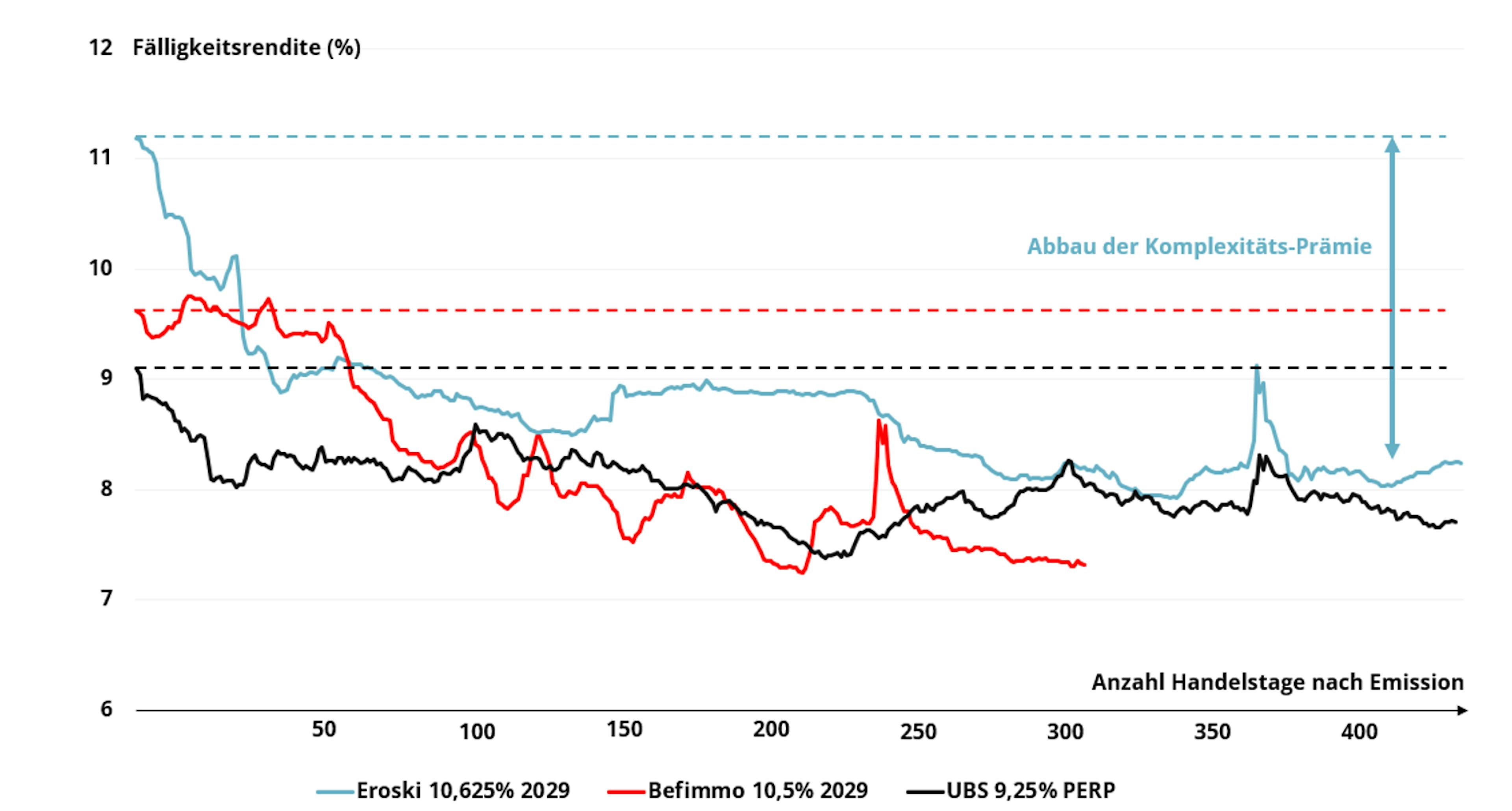 Abbildung 3: Entwicklung der Rendite bis zur Fälligkeit von drei Emissionen – Rückgang der Komplexitätsprämien nach Emittent