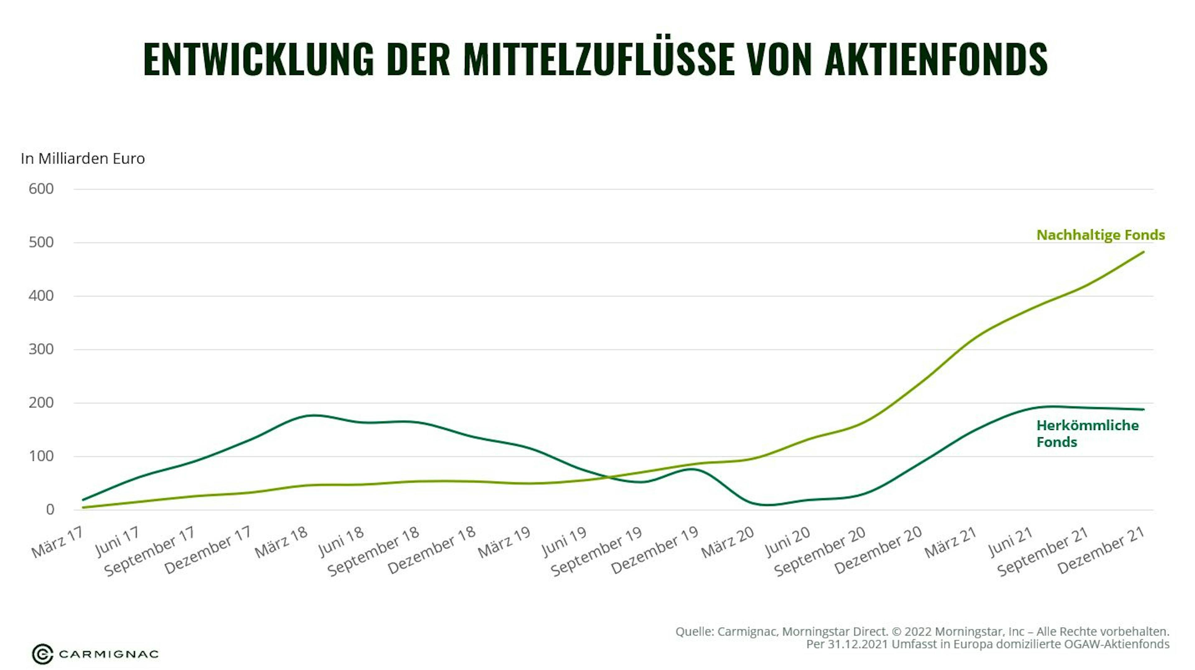 Viele Sparer hegen den Wunsch, dass ihre Anlagen im Einklang mit ihren Werten und Überzeugungen stehen. Gemäß von Morningstar und Carmignac bereitgestellten Daten verzeichneten nachhaltige Aktienfonds in den vergangenen fünf Jahren bis Ende 2021 Nettozuflüsse (Differenz zwischen Zu- und Abflüssen) in Höhe von 483 Milliarden Euro gegenüber 188 Milliarden Euro für herkömmliche Fonds im gleichen Zeitraum1 .