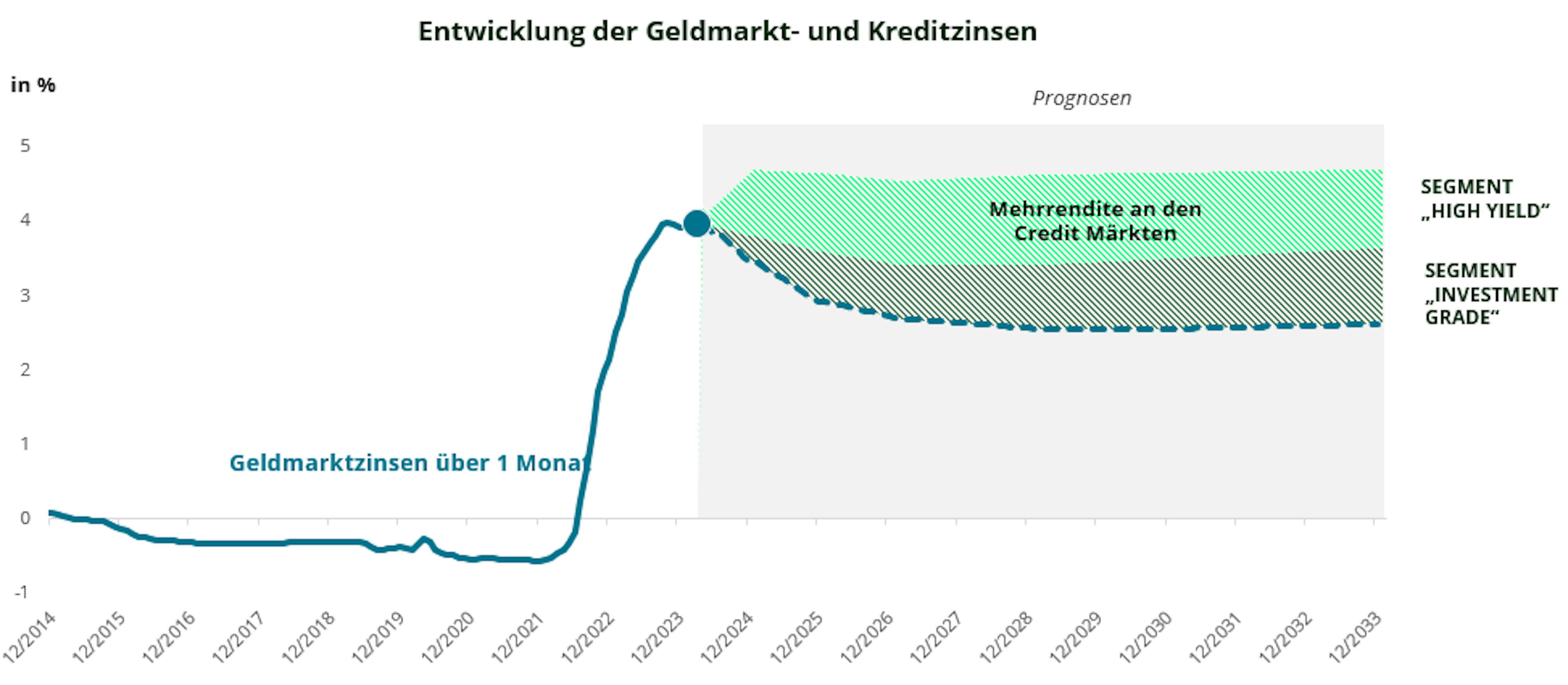 Man sollte sich jetzt schon für die Zukunft attraktive Renditen sichern. Die Credit-Märkte bieten ein Renditeplus, das Anleger sich für die kommenden Quartale oder sogar Jahre sichern können – der grün schraffierte Bereich in der Grafik entspricht der Zusatzrendite, die die Credit-Märkte zurzeit im Vergleich zu den Geldmarktzinsen bieten. Anders ausgedrückt: Jeder Anleger, der seine Geldmarktpositionen hält oder sein Kapital erst verspätet umschichtet, ist mit einem entgangenen Gewinn zwischen 1% und 2% pro Jahr konfrontiert – ein nicht unerheblicher Performanceverlust.