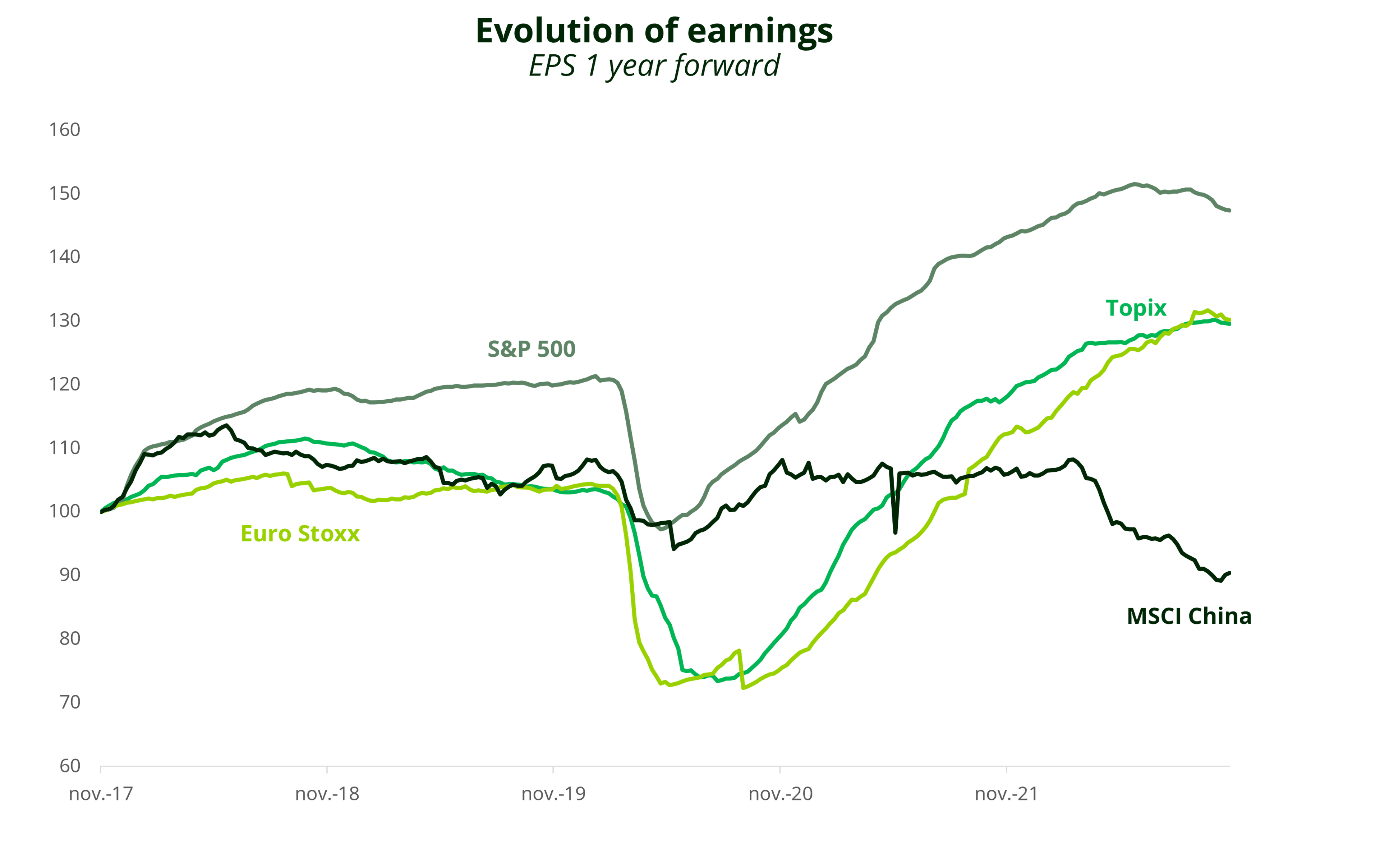In equity markets, while the drop in valuations appear broadly consistent with a recessionary backdrop, there are wide disparities between regions - even more so on earnings. Earnings expectations remain high in the US and Europe, which is not the case in China, nor in Japan given the fall of the yen. And the eyes of global investors are focused on the western world inflation and growth dynamics. Looking towards the East should prove salutary and offer most welcomed diversification.