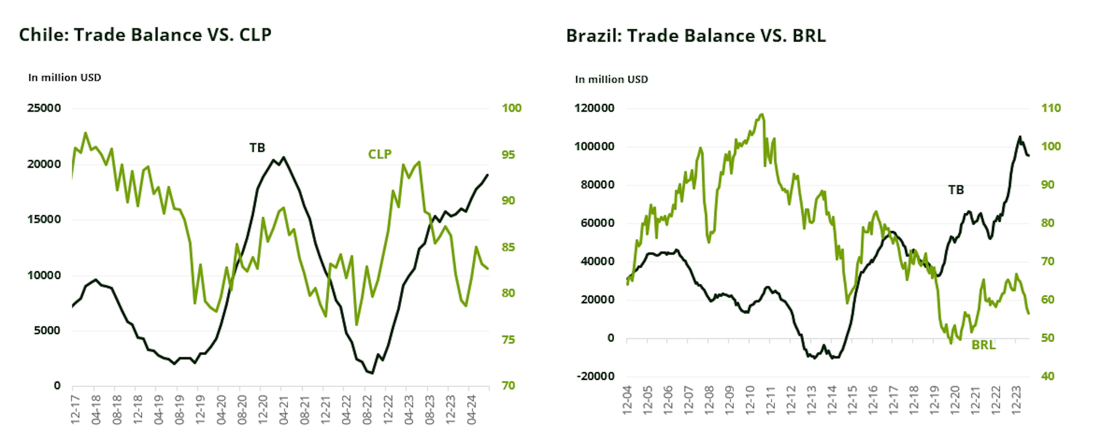 Emerging market currencies are influenced by fundamental and technical factors that shape their value such as real interest rates and current account dynamics. One of the most important factors is the flow of money into a country from abroad, monitored through the current account and more specifically the trade balance. A positive and expanding trade balance, indicates more exports than imports, leads to money inflows and strengthens the currency of a country.