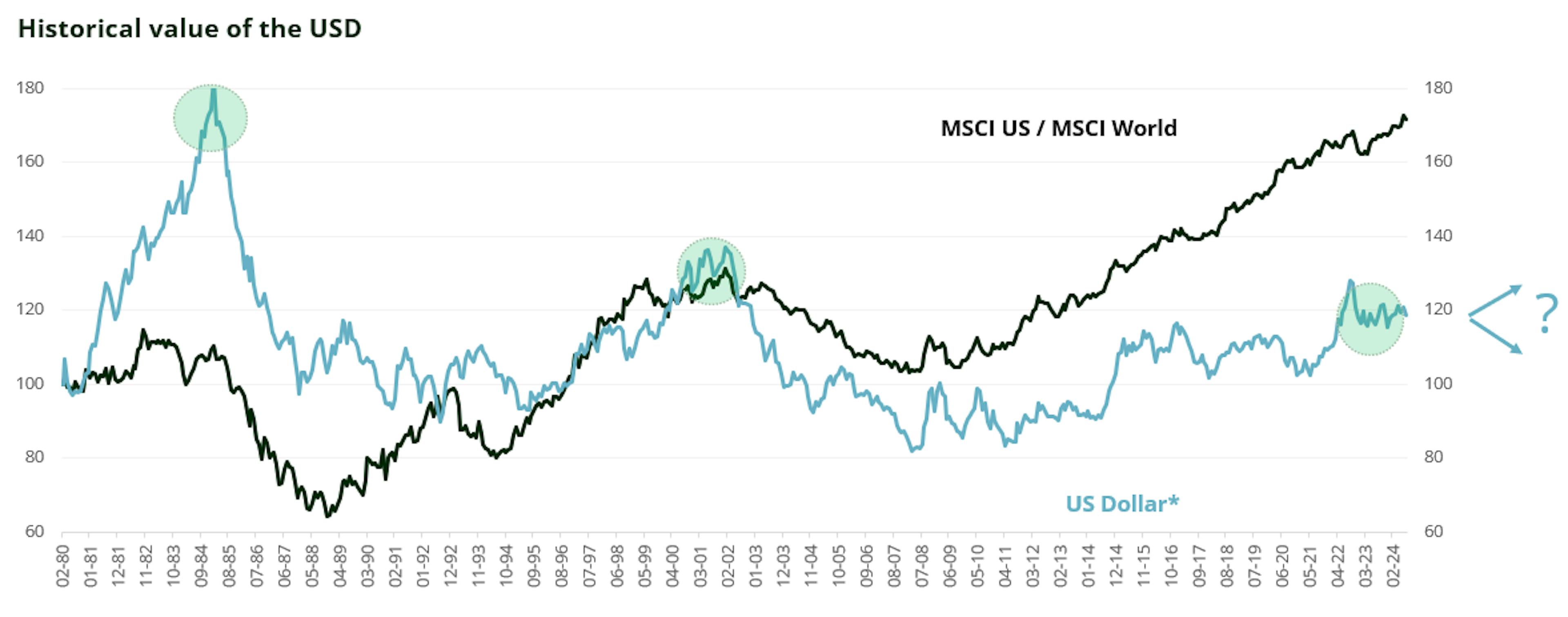 Today, the USD cycle is breaking this 8–10-year pattern mainly supported by the exceptionalism in US growth and the ongoing US fiscal stimuli. Our view is that the turning point from the USD cycle peak may be occurring, but it is certainly expected to be slower than initially predicted, unless there is a sharp US fiscal contraction in the near future.