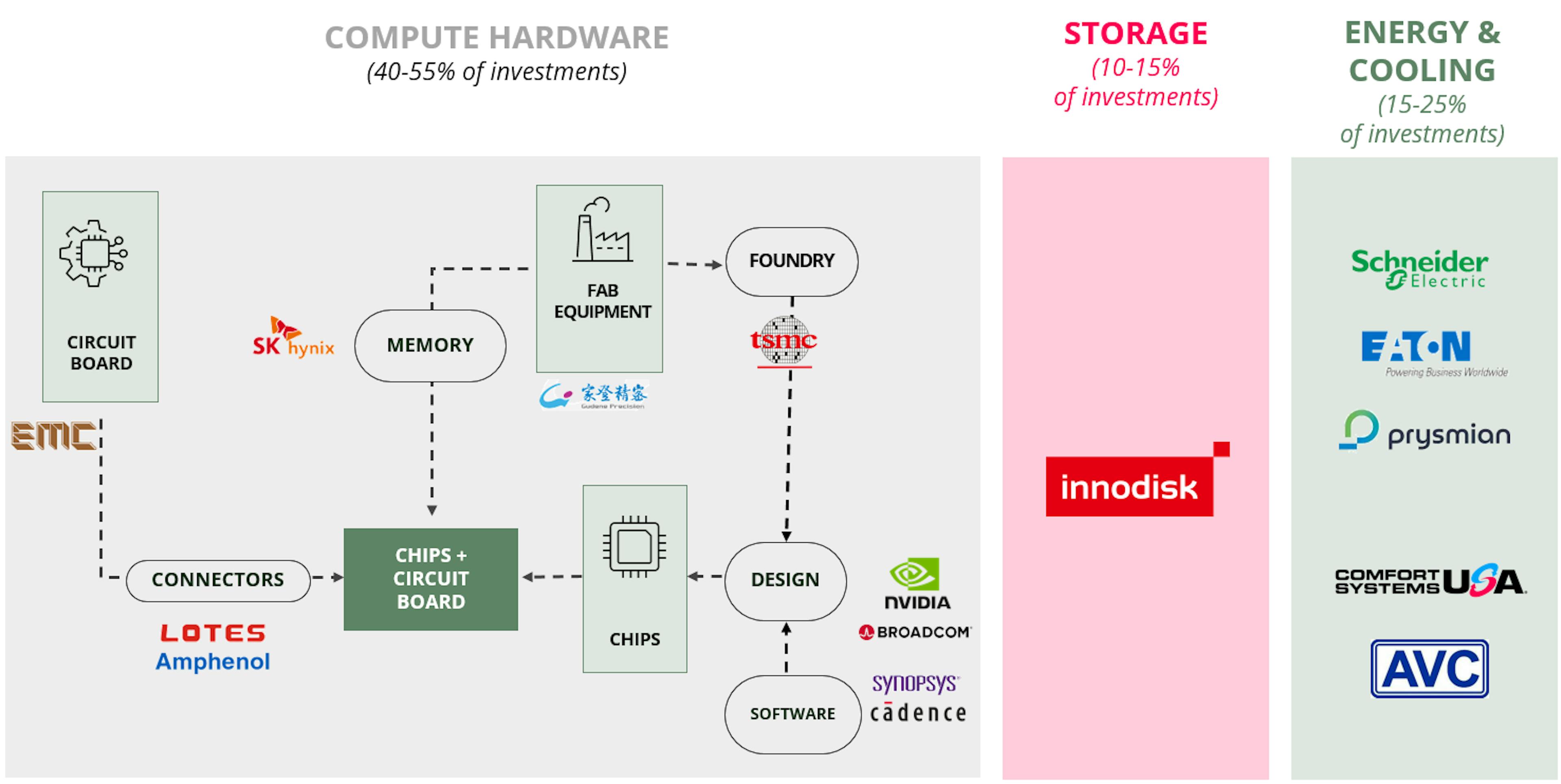 In the United States, the energy capacity of data centers is expected to quintuple by 2030, reflecting the surging demand for computing power1. This rapid expansion of AI is intensifying pressure on hyperscale data centers, driving substantial infrastructure investments to scale their computing and storage capabilities. While companies such as Nvidia and TSMC are often cited as the cornerstones of this relentless race for computing power, many lesser-known—but equally essential—players are also benefiting from this momentum.