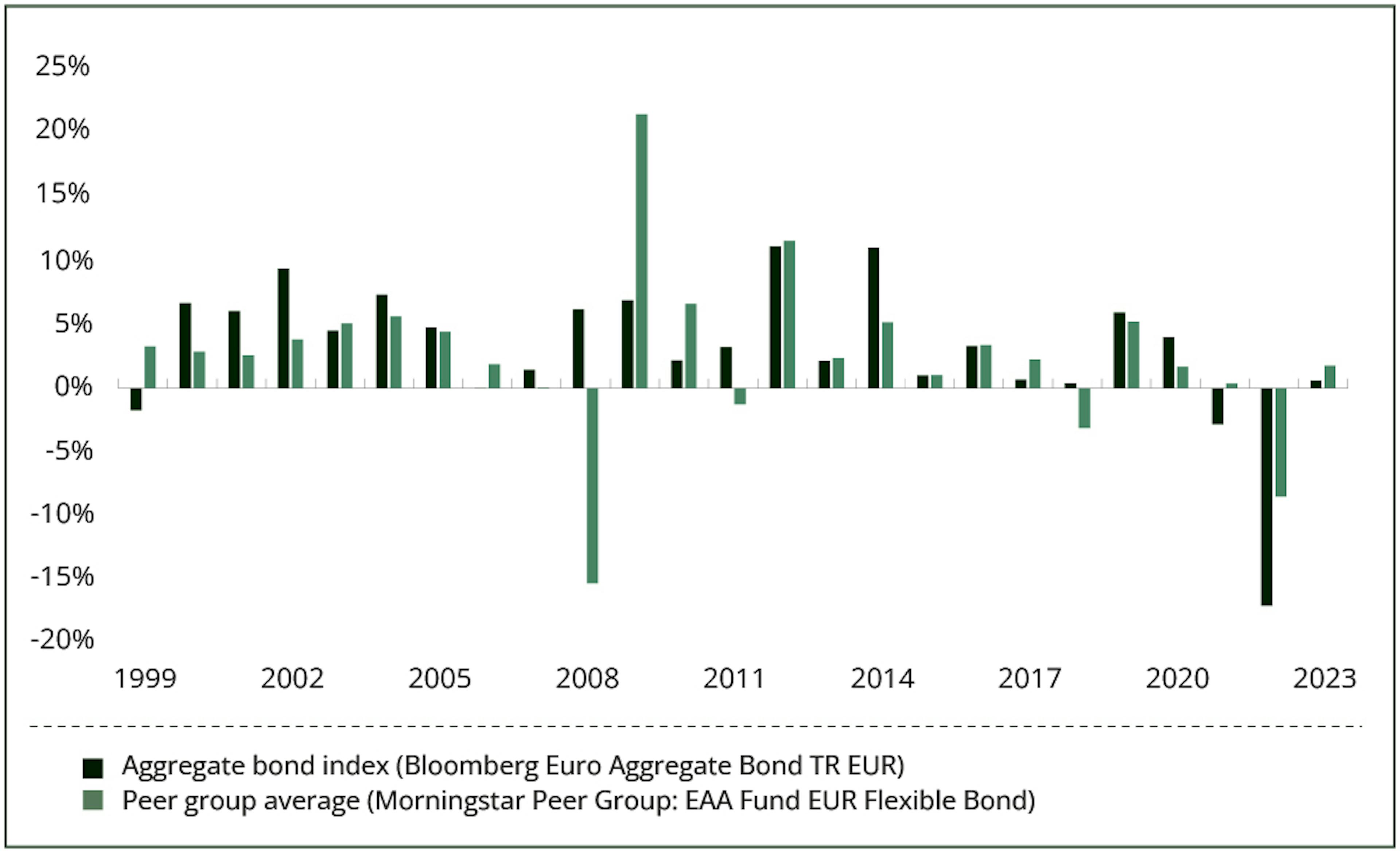 Calendar year returns of the Euro Aggregate index and the Morningstar EUR denominated Flexible Bonds category