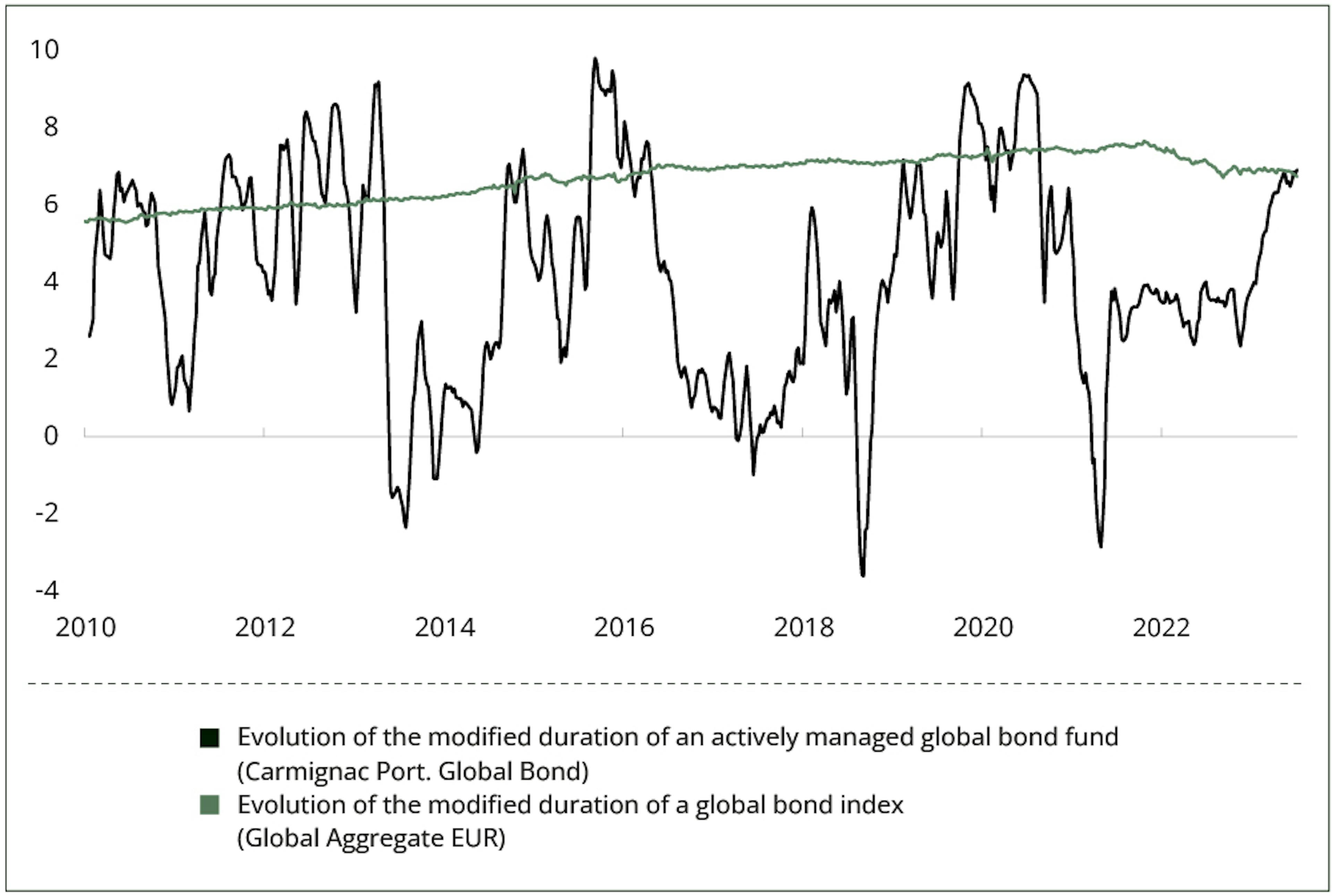 Evolution of the modified duration of an actively managed global bond fund and of a global bond index
