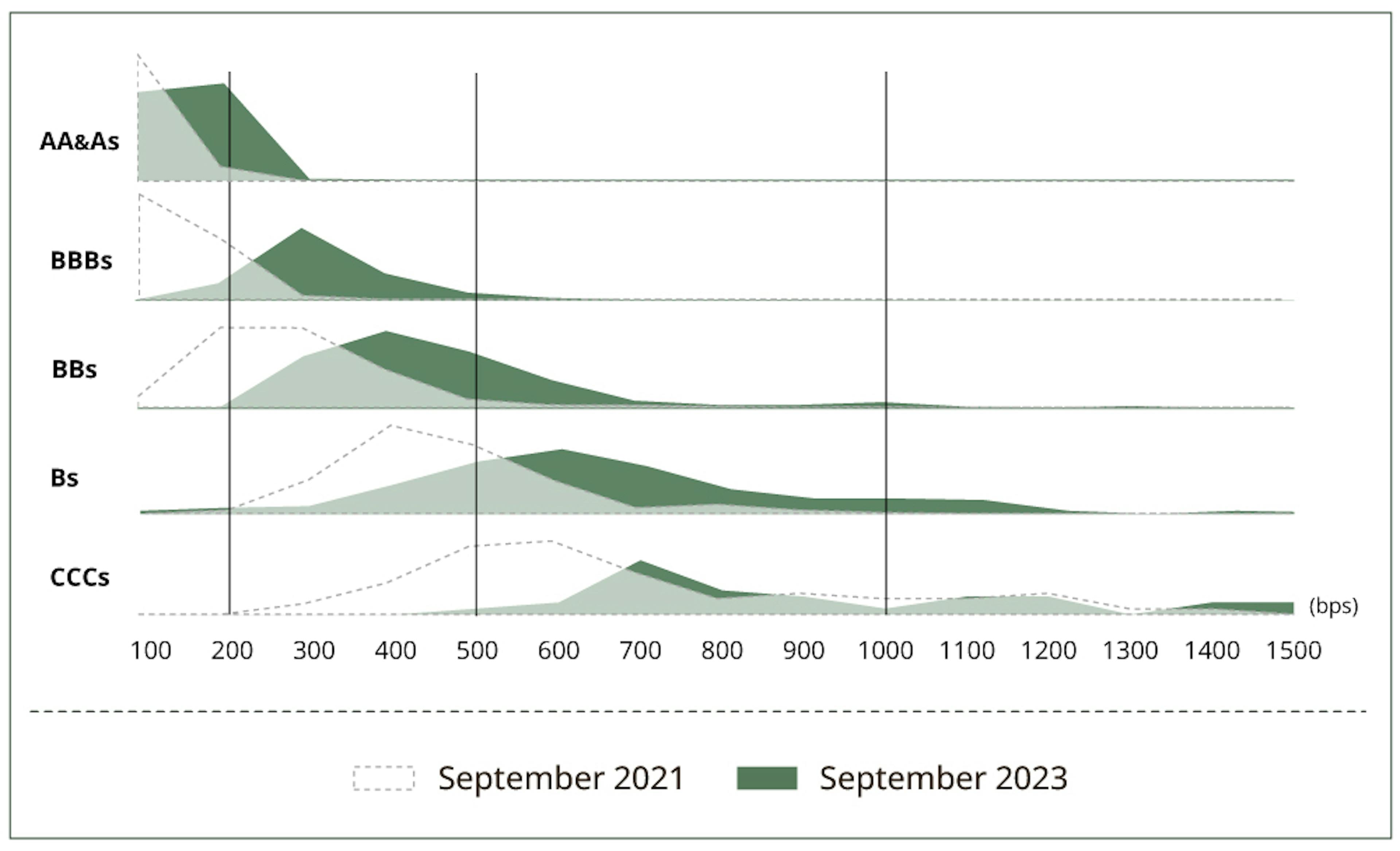 The chart illustrates the evolution of dispersion within credit indices. To illustrate dispersion, within each credit rating bucket we break down European corporate credit indices by level of credit spread today (dark areas are as of September 2023) and two years ago (transparent and dotted areas are as of September 2021). Two elements stand out. First, the distribution of credit spreads has shifted to the right: credit risk premiums have risen overall. And second, the distribution curves have flattened and widened: dispersion has increased, with wider spreads among issuers with a similar rating.