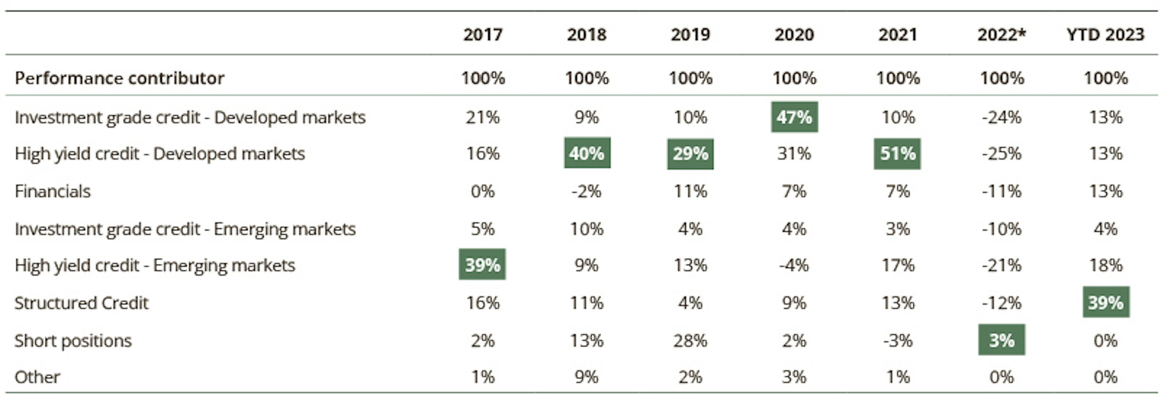 The first is that a diversified allocation enables investors to benefit from the complementary nature of the different fixed income segments. For example, in a market phase such as the one seen in 2022 and 2023, variable-rate segments, such as structured credit, benefited from the rise in interest rates while the other segments suffered from the underperformance of the price component of bonds. The table below illustrates that while no two years are alike - and the same holds true for performance contributors - this is advantageous for investors in segment-agnostic funds.