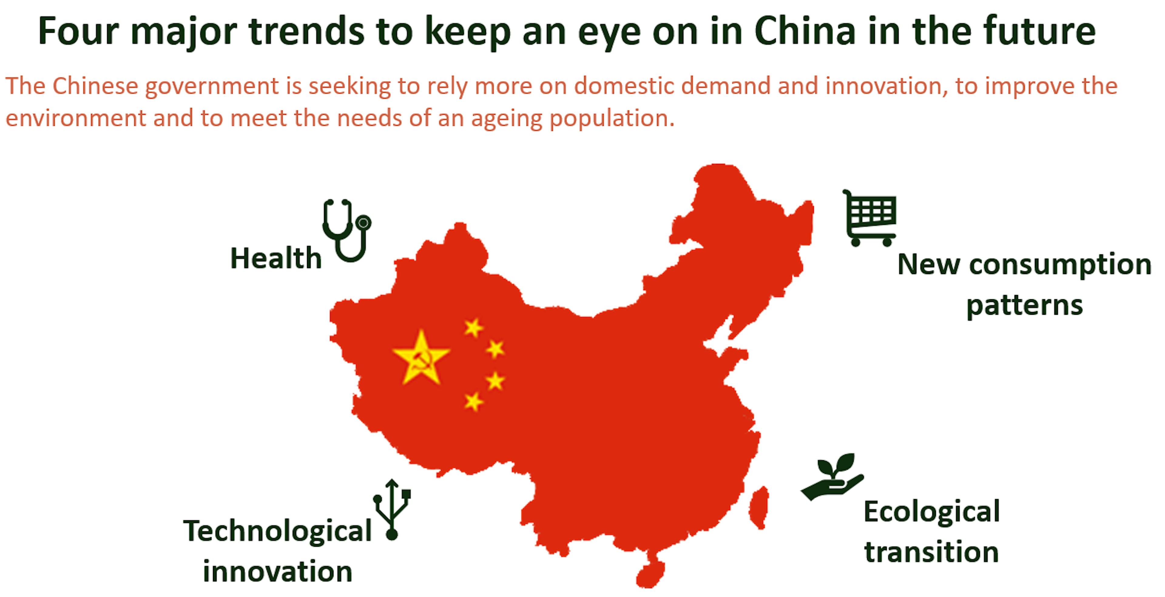 Therefore, the Chinese government has announced its 2021- 2035 development plan in response to these demographic and economic challenges, and also to create new engines of growth. The resulting reforms highlight four major long-term trends that offer numerous investment opportunities: technological innovation, ecological transition, changing consumption patterns and health and medical innovations.