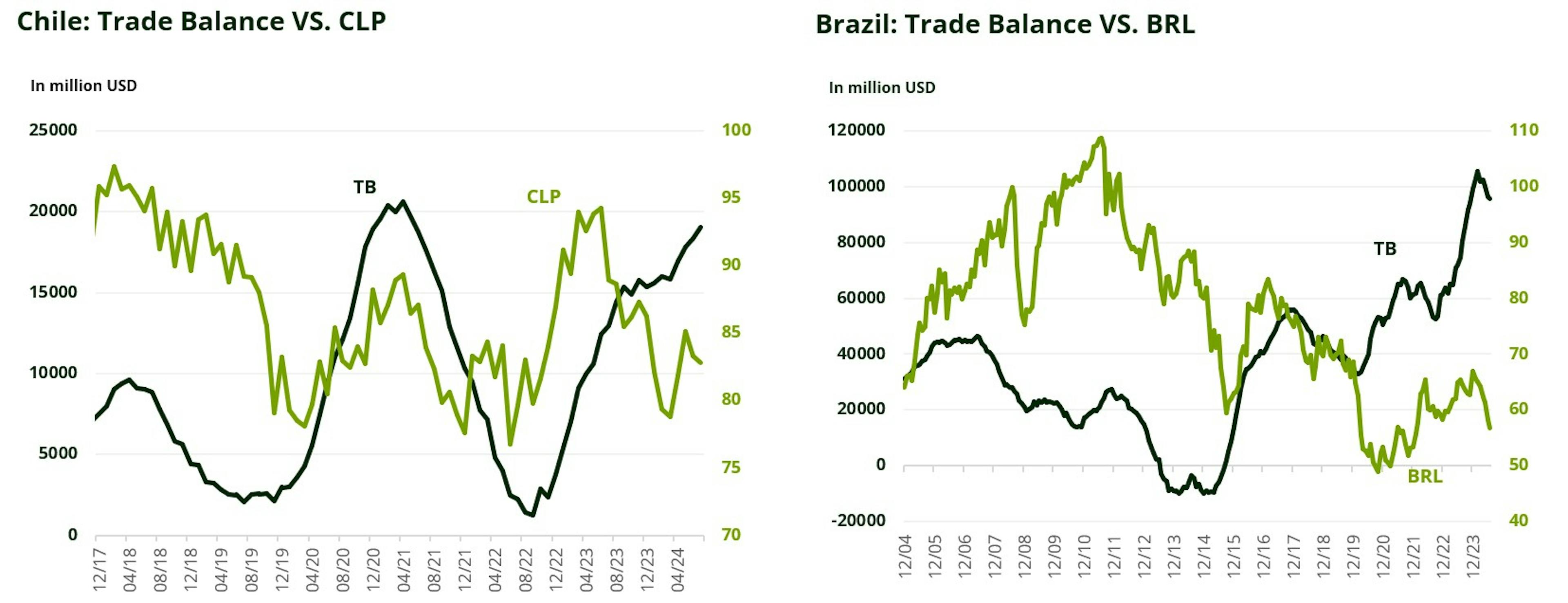 Emerging market currencies are influenced by fundamental and technical factors that shape their value such as real interest rates and current account dynamics. One of the most important factors is the flow of money into a country from abroad, monitored through the current account and more specifically the trade balance. A positive and expanding trade balance, indicates more exports than imports, leads to money inflows and strengthens the currency of a country.