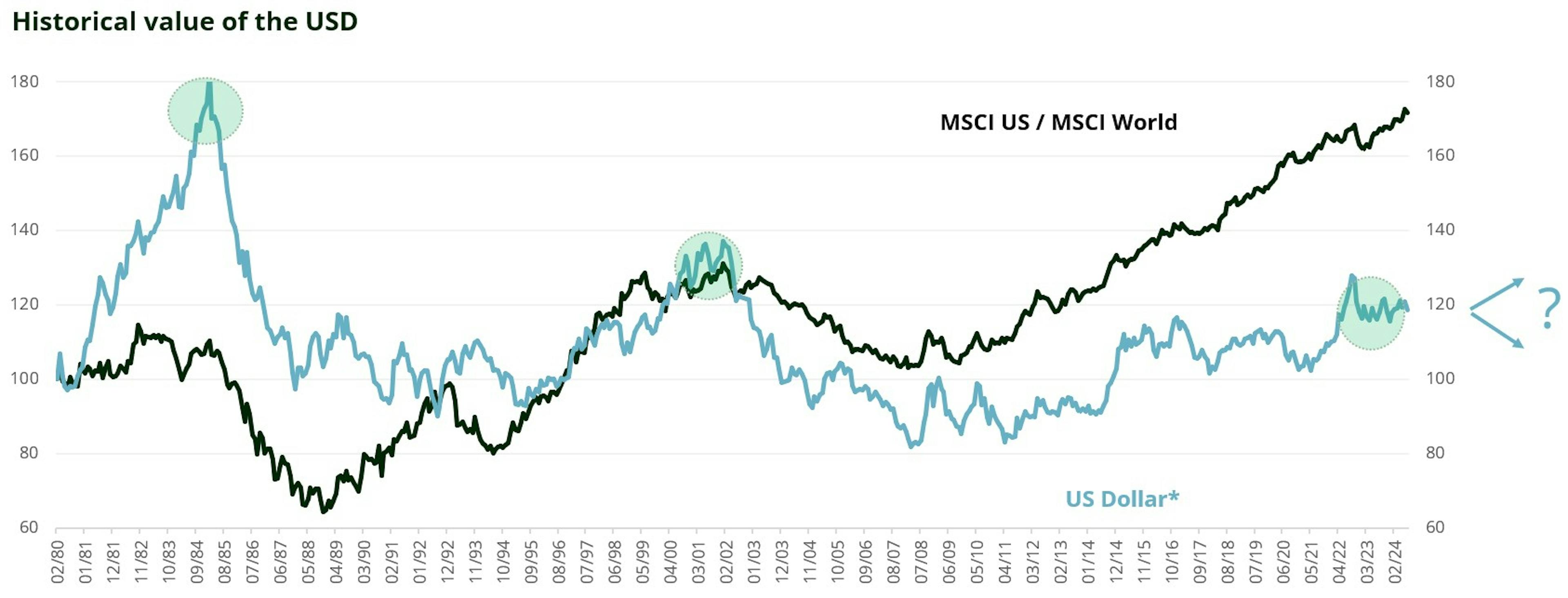 Today, the USD cycle is breaking this 8–10-year pattern mainly supported by the exceptionalism in US growth and the ongoing US fiscal stimuli. Our view is that the turning point from the USD cycle peak may be occurring, but it is certainly expected to be slower than initially predicted. As, the US growth starts to slow down this should also affect the USD.