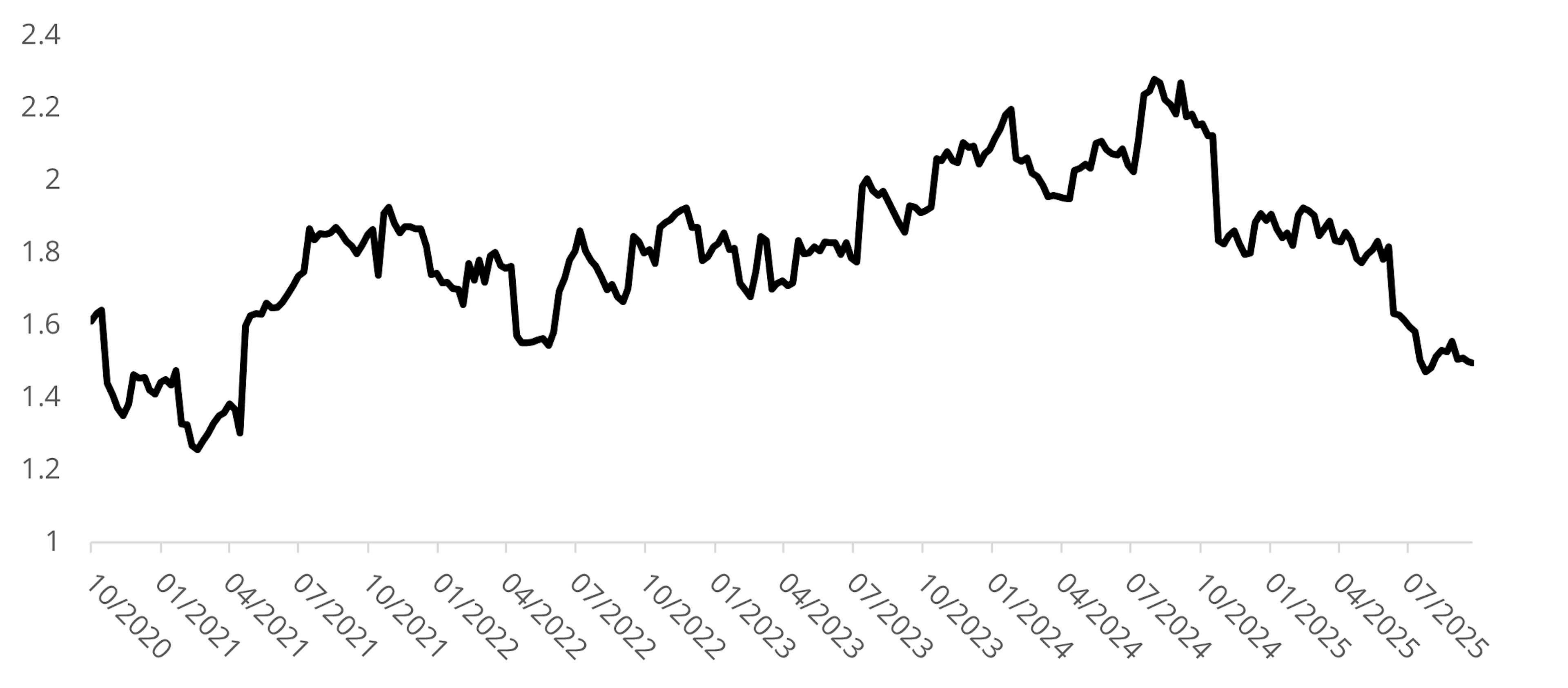 Year to date, the U.S. dollar has depreciated by over 10%, one of its sharpest declines in decades. This weakness has been driven by growing political, fiscal, and trade policy uncertainty under the Trump administration. The resulting currency move has acted as a significant headwind for European quality growth companies with substantial U.S. dollar revenues, compressing reported earnings and margins in euro terms.