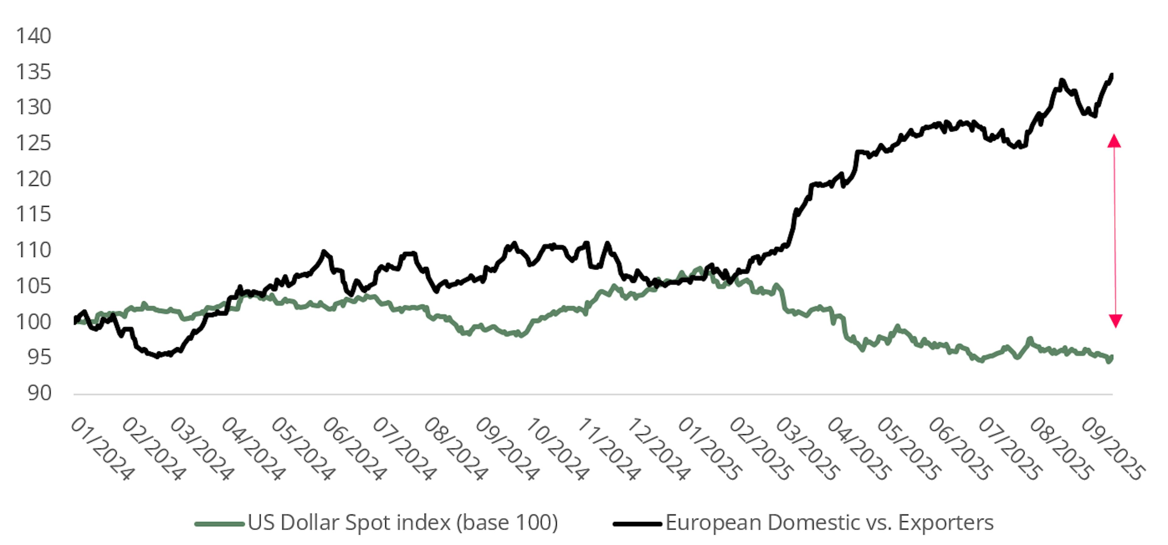 Similarly, Tariffs have also been a disruption for European names with international exposure due to margin pressure, revenue risk, and subsequently investor sentiment. This has encouraged the relative attraction to domestic sectors.