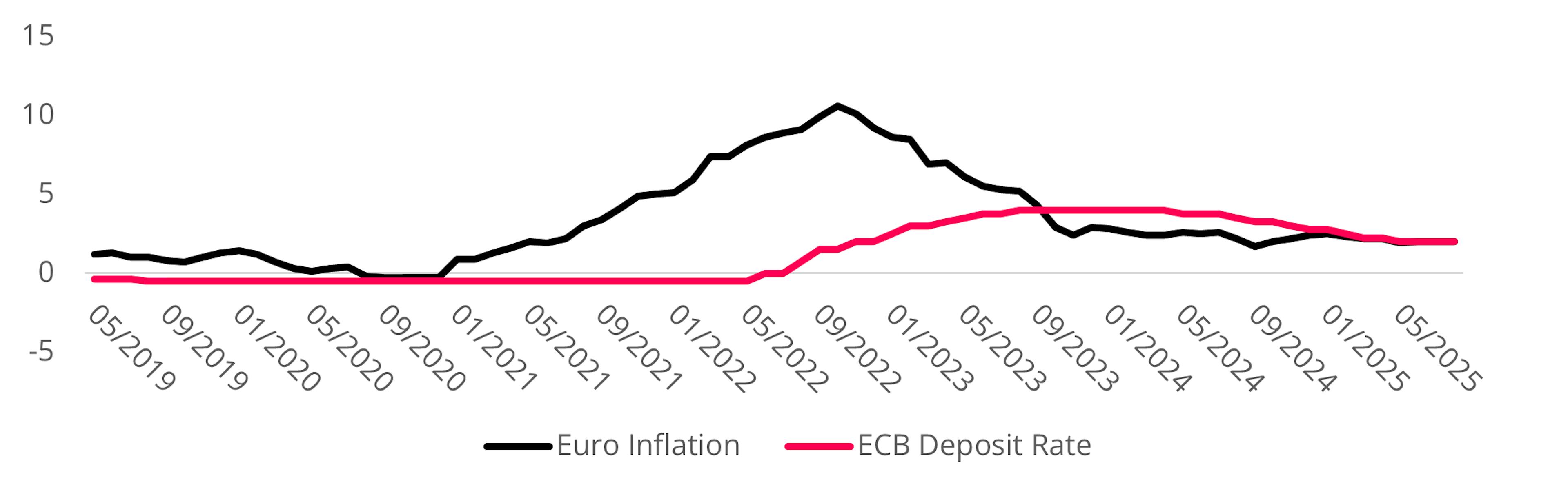 Higher rates boosted banks’ profitability through wider net interest margins. The rise in interest rates above zero in Europe since 2022 boosted banks’ profitability through wider net interest margins. Domestic focused sectors such as Utilities and Telecoms, with no dollar exposure or tariff risk, were favoured.