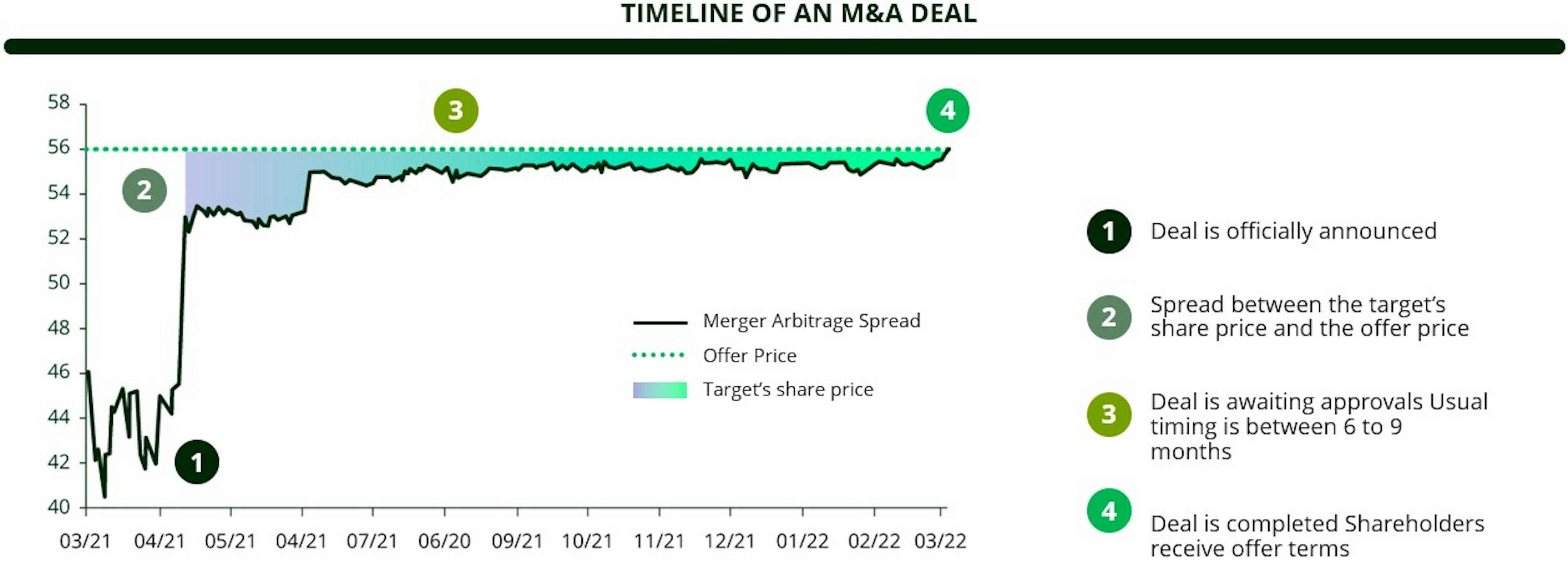 After an M&A deal is announced, the stock price of the target company generally sits below the acquirer’s bid price for a period of time. This price discrepancy – called the Merger Arbitrage spread (or discount) – is what Merger Arbitrage investors aim to generate a return from if the deal goes through.