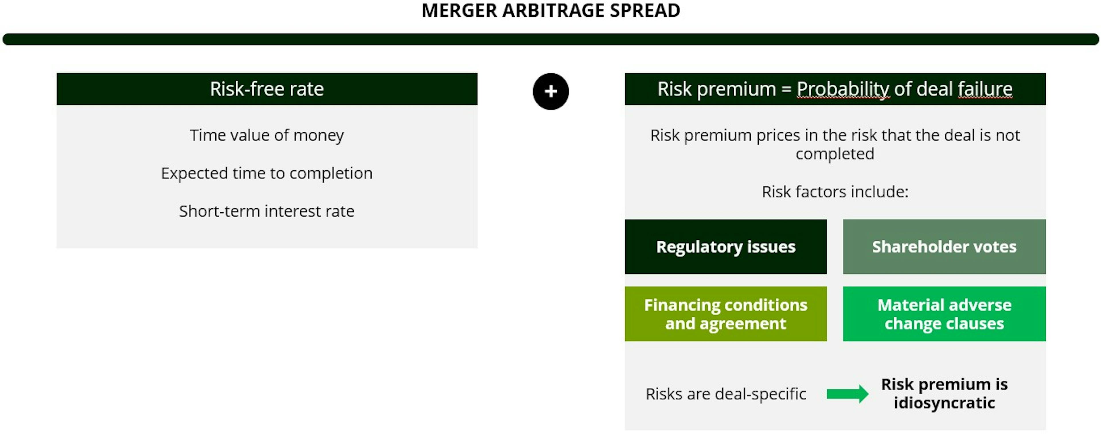The Merger Arbitrage spread – or the return an investor can expect to receive – is the sum of two factors: