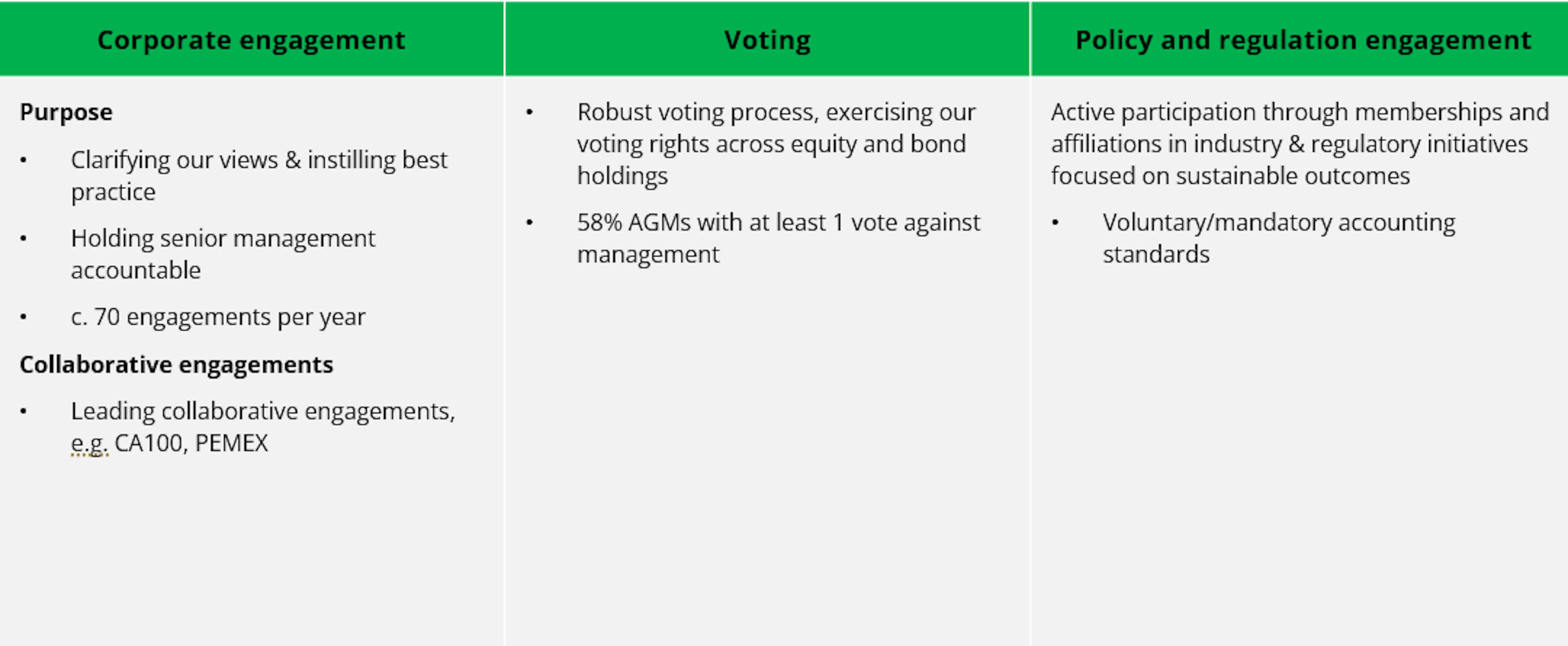 Active engagement and voting, holding investee companies to account on ESG-related issues to drive positive change