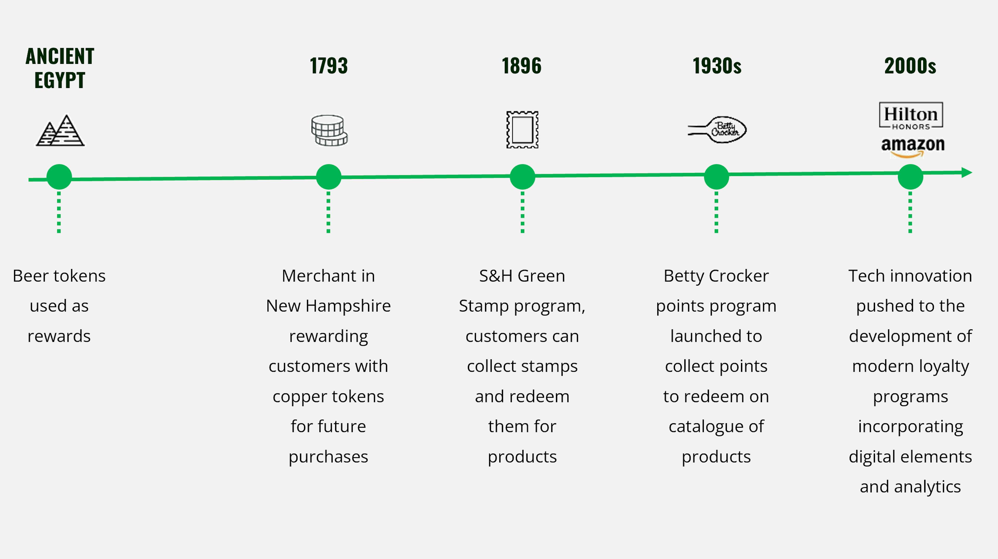 The concept of loyalty programs has evolved over time. Early forms of loyalty programs can be traced back to Ancient Egypt, where beer tokens were used as a form of rewards. In 1793, a merchant in Sudbury, New Hampshire, began rewarding customers with copper tokens for future purchases. The S&H Green Stamp program in 1896 and the Betty Crocker Points Program in the 1930s are notable examples of early loyalty efforts.