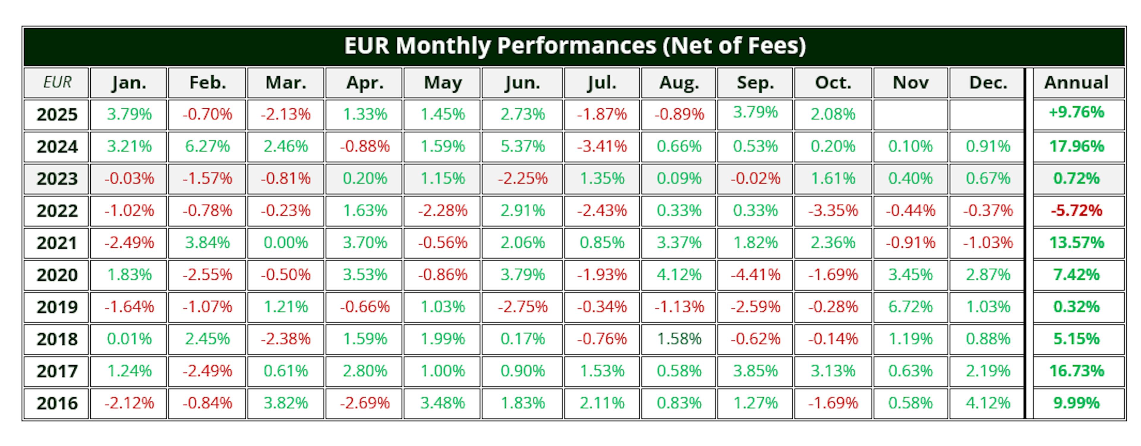 The Fund posted a +2.08% return for the month of October, net of fees in our F EUR Acc share class (+2.23% for the F USD HDG share class). Year-to-Date, the fund is up +9.76% (+11.07% for the F USD HDG share class).