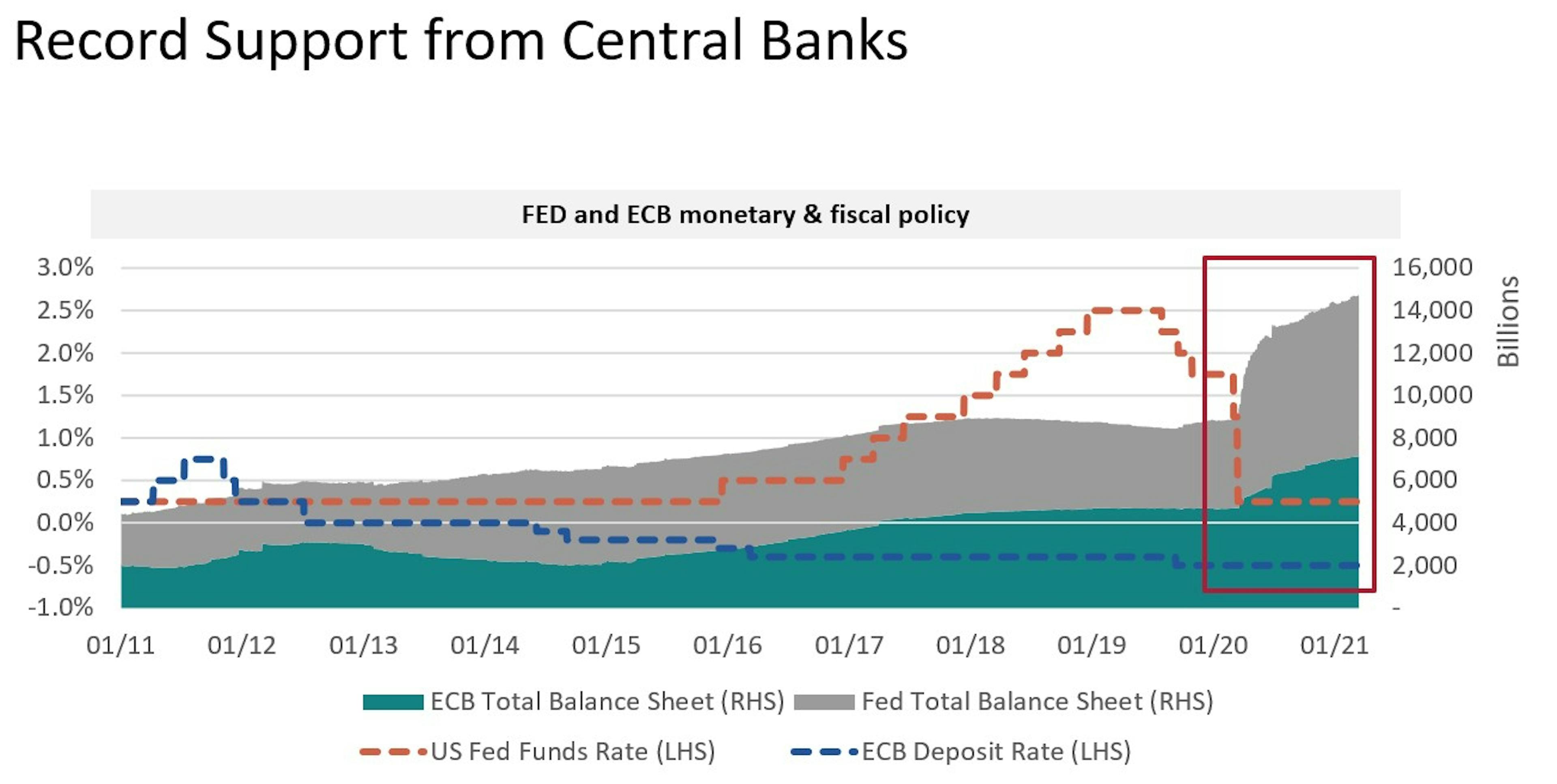 The central banks nonetheless kept a level head. While for the most part reiterating their commitment to highly dovish policies (stressing that their economies were still far from reaching their inflation and full-employment targets), they showed they were rather at ease with the trend towards rising interest rates. This led to a welcome increase in inflation expectations and higher economic growth.