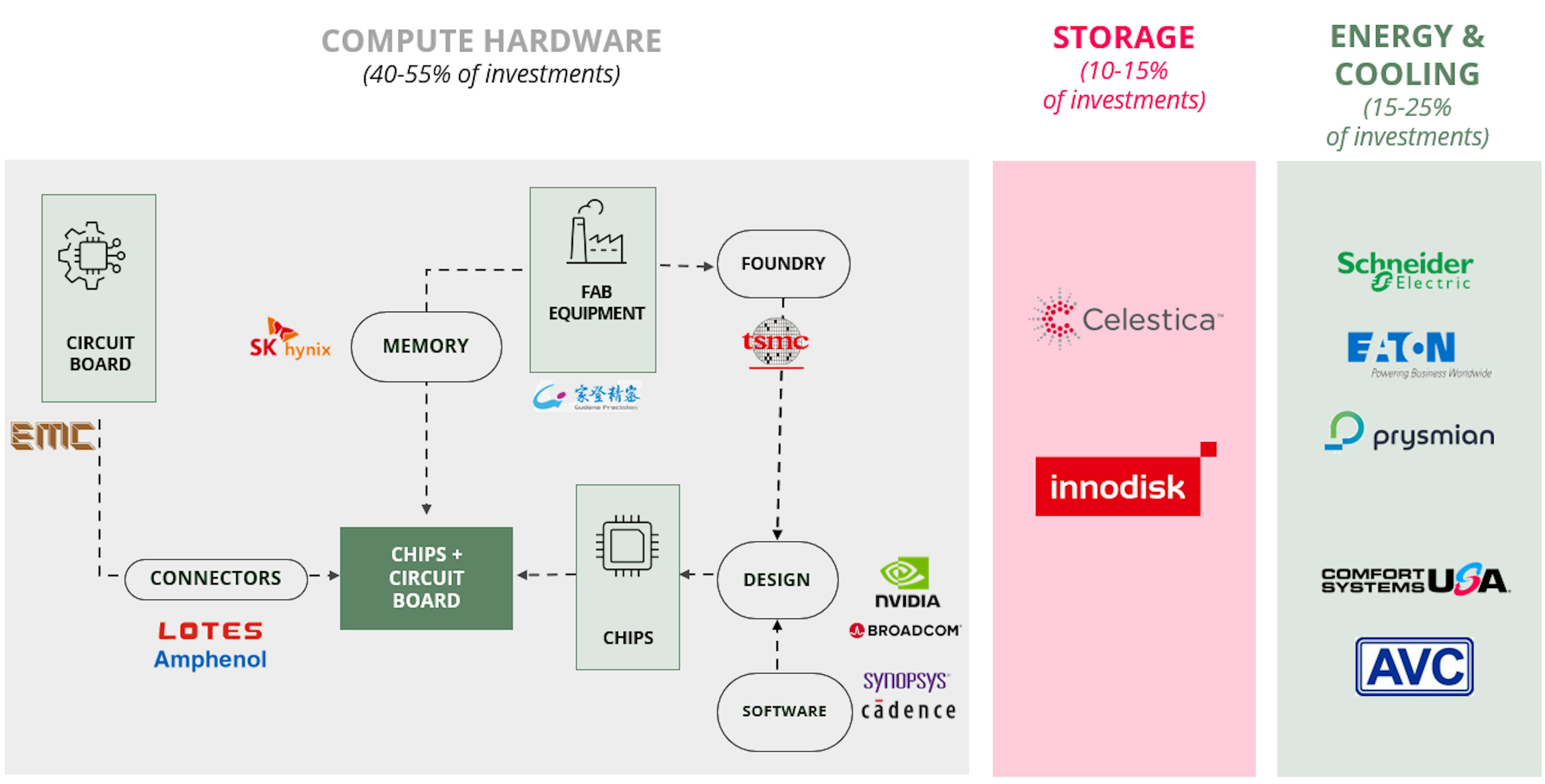 When building a data center, semiconductors account for roughly 50% of capital expenditure, while the remaining 50% is devoted to costs related to storage, energy, and cooling1.