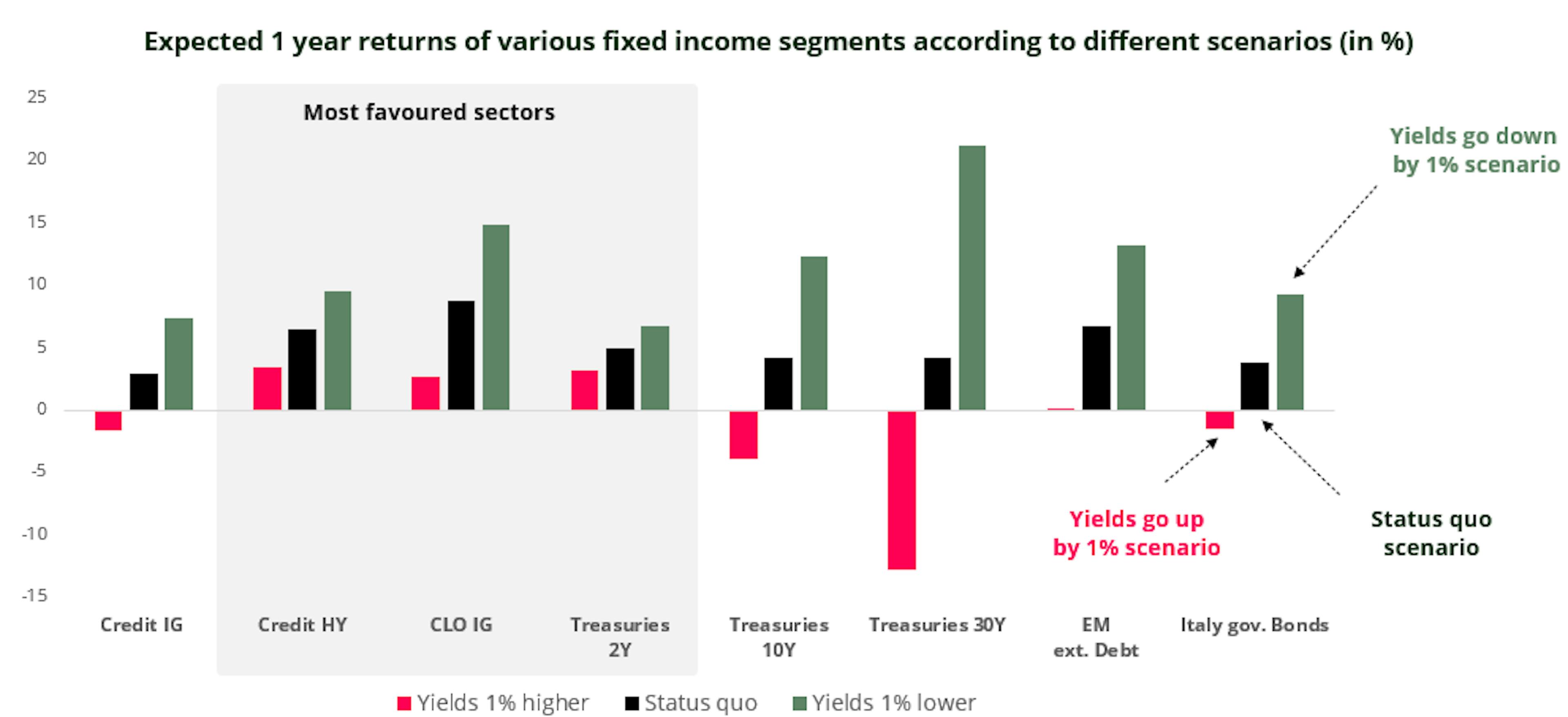 It’s interesting to note that in the fixed income space, our simple yet realistic model shows that some segments would deliver positive returns under all three scenarios. Credit markets offering attractive yields, structured credit, and short-term government bonds are particularly appealing and therefore hold a decisive role in our allocation.