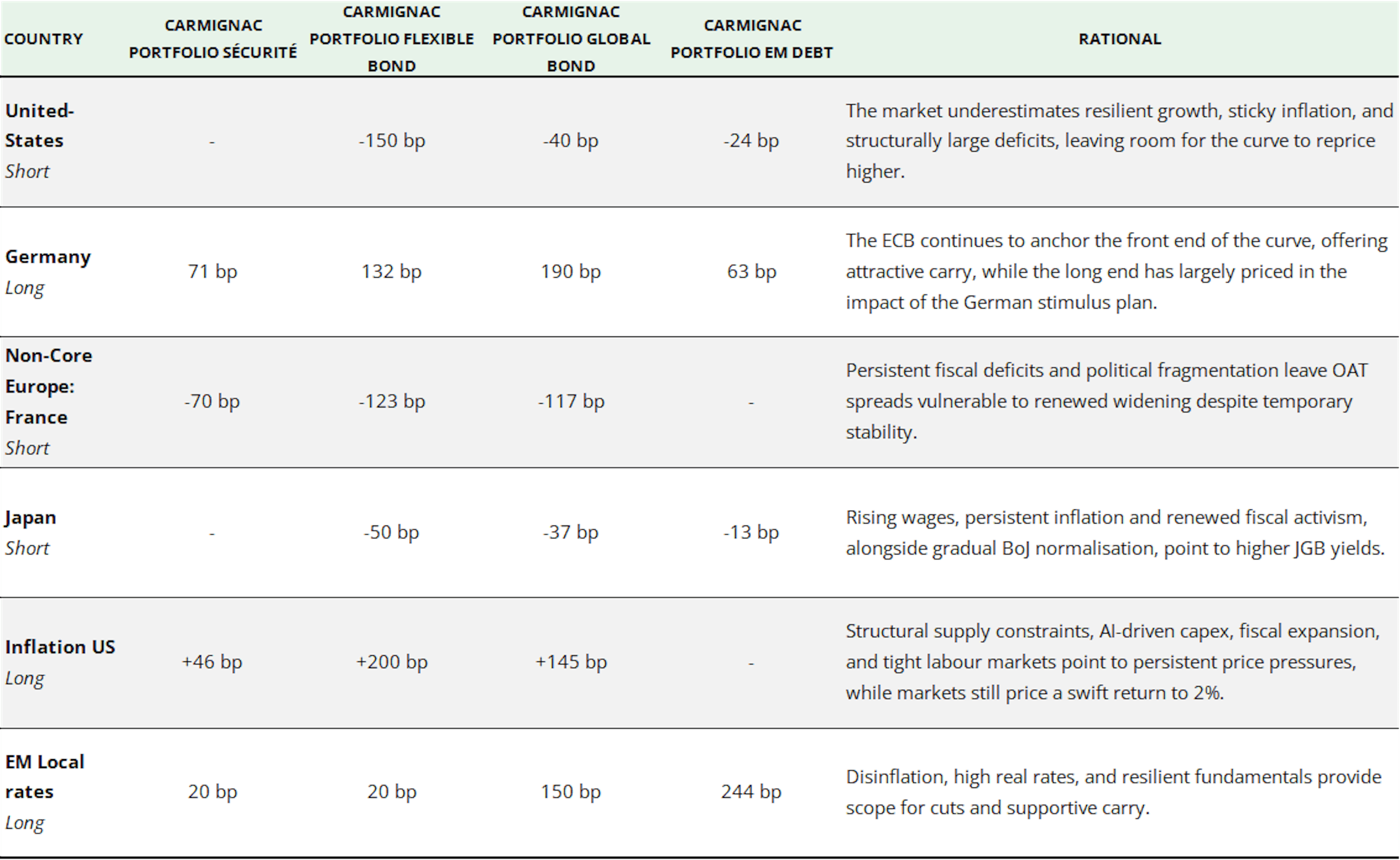 Against this backdrop, we favour differentiated duration exposure: short US and Japan, long Germany, cautious on non-core Europe and constructive on selected emerging markets.