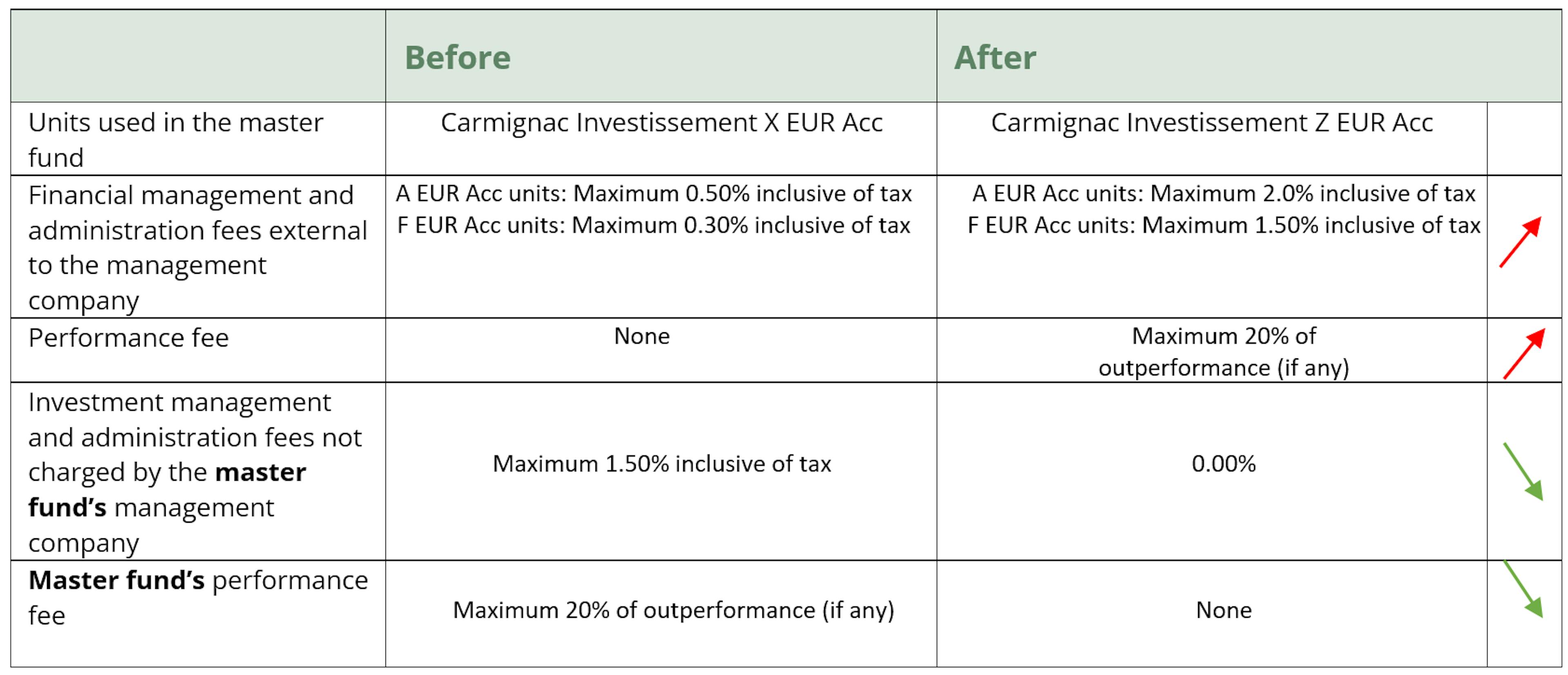 From 30 December 2024, the Fund will no longer invest in the X EUR Acc units of Carmignac Investissement, its master fund, but in the Z EUR Acc units instead. This change will have no effect on the Fund’s strategy, with at least 85% of its portfolio continuing to be invested in its master fund and, on an ancillary basis, in cash.