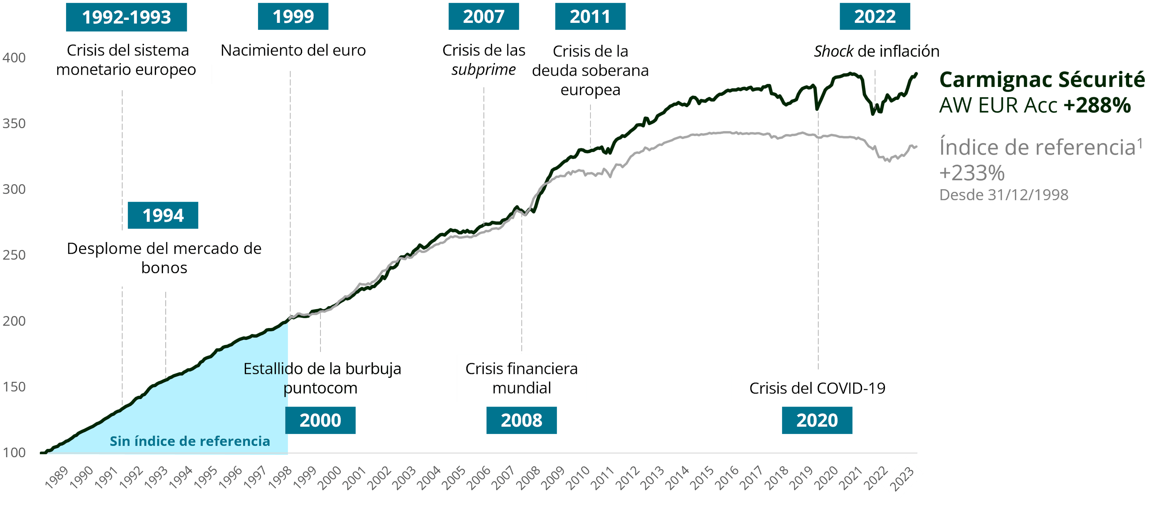 Fuente: Carmignac. Rentabilidad acumulada desde el lanzamiento del Fondo el 26/01/1989 hasta el 28/03/2024 y del indicador de referencia desde el 31/12/1998 hasta el 28/03/2024. (1) Índice de referencia: ICE BofA ML 1-3 Year All Euro Government Index (con reinversión de cupones). Hasta el 31 de diciembre de 2020, el índice de referencia era el Euro MTS 1-3 años (desde el 31/12/1998, fecha de introducción del euro, y del índice Euro MTS 1-3 años). Las rentabilidades se presentan mediante el método del encadenamiento. Las rentabilidades históricas no garantizan rentabilidades futuras. Las rentabilidades se expresan netas de gastos (salvo los posibles gastos de entrada aplicables pagaderos al distribuidor), según proceda. La rentabilidad puede subir o bajar a resultas de las fluctuaciones en los tipos de cambio en el caso de las participaciones que carezcan de cobertura de divisas.