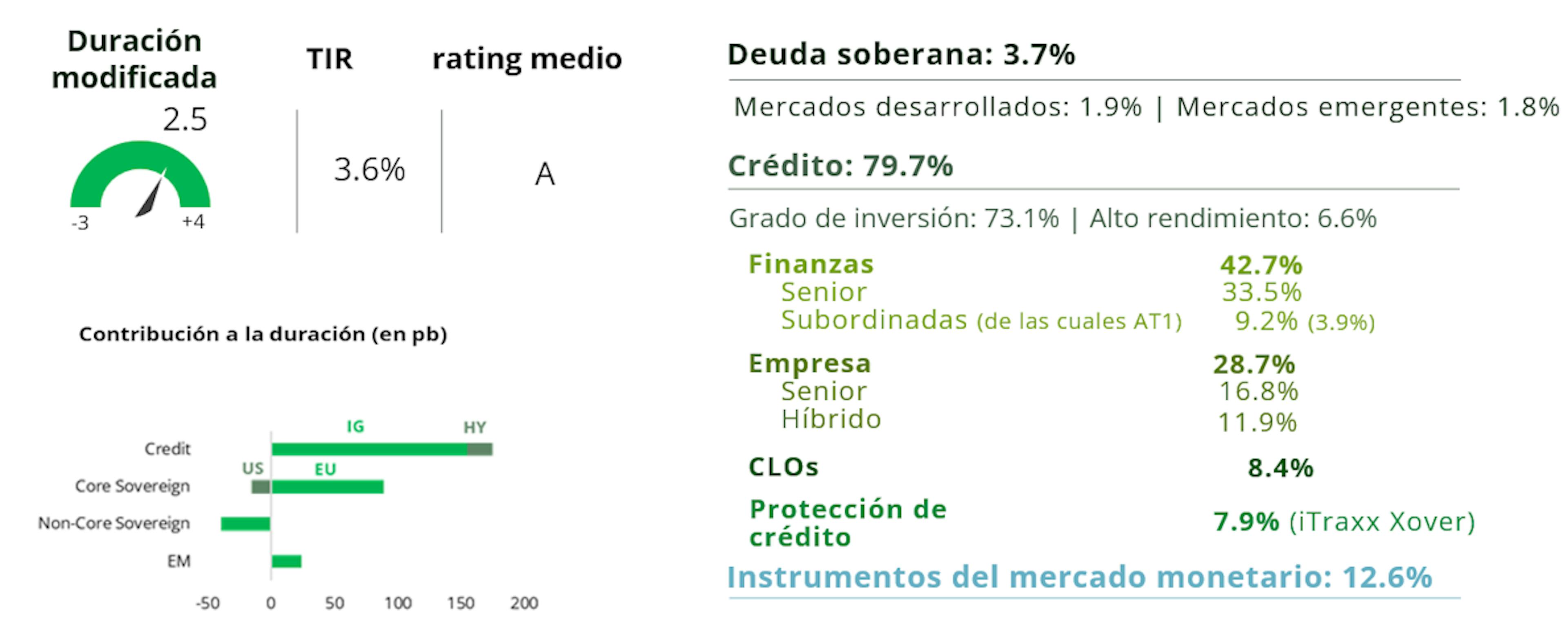 En este contexto, el fondo registró una rentabilidad positiva, aunque quedó por debajo de su indicador de referencia. La cartera se benefició principalmente del repunte de los tipos europeos, que también respaldó su exposición a crédito; no obstante, la rentabilidad se vio ligeramente lastrada por nuestra limitada exposición en EE. UU., en particular una posición corta en el Treasury a 10 años y una estrategia larga en inflación.