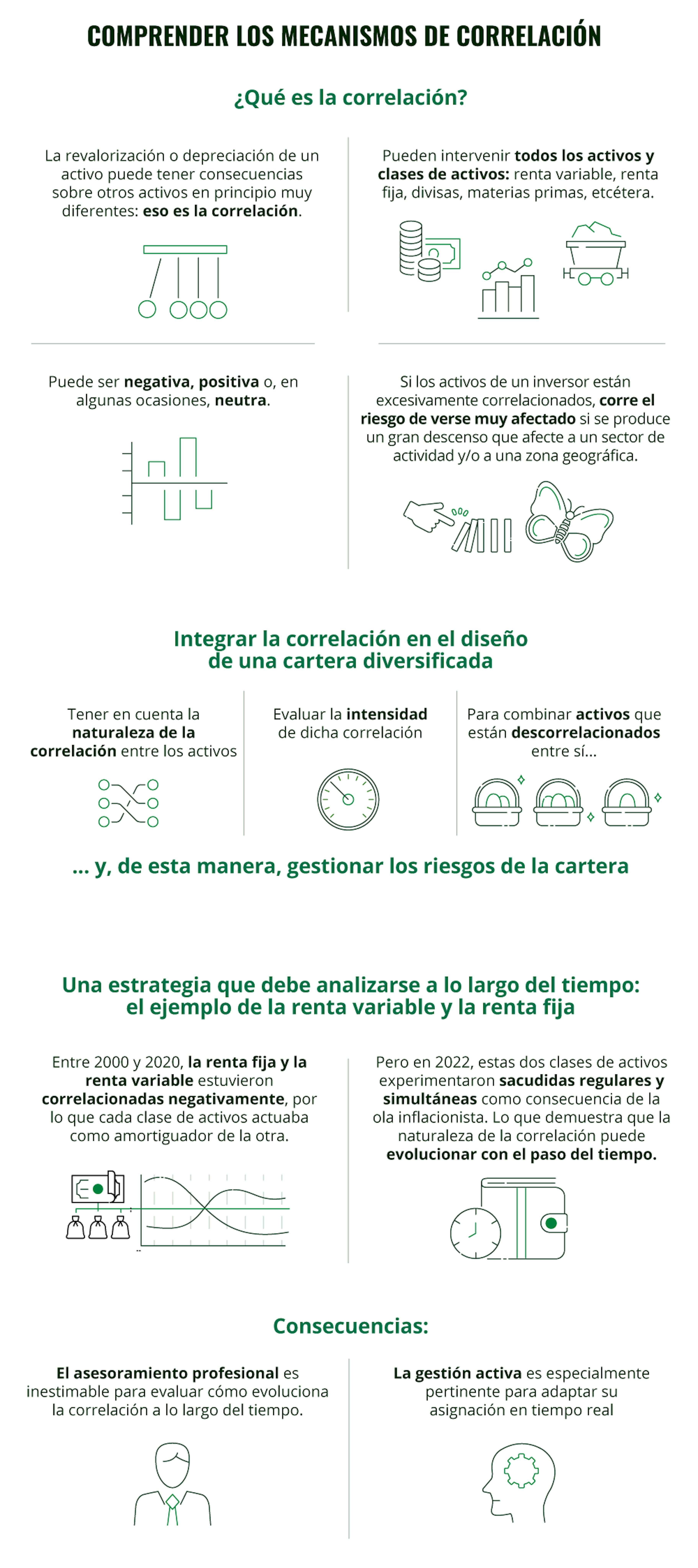Todo esto demuestra que el recurso a la correlación en la diversificación de una cartera puede ayudar a limitar los riesgos al repartir las inversiones entre diferentes activos y clases de activos como acciones, bonos, materias primas, divisas, bienes inmuebles, etcétera.