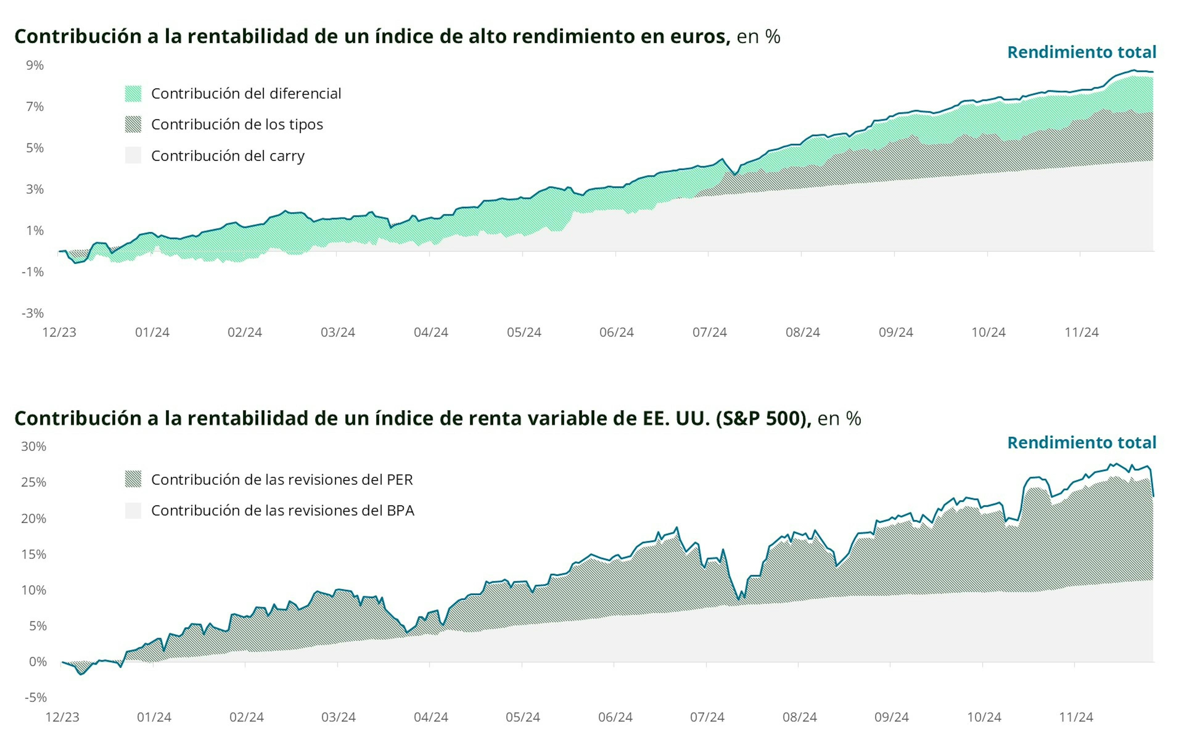 El siguiente gráfico desglosa los factores impulsores (y detractores) de la rentabilidad de los mercados de renta variable de Estados Unidos y de los mercados europeos de alta rentabilidad.
